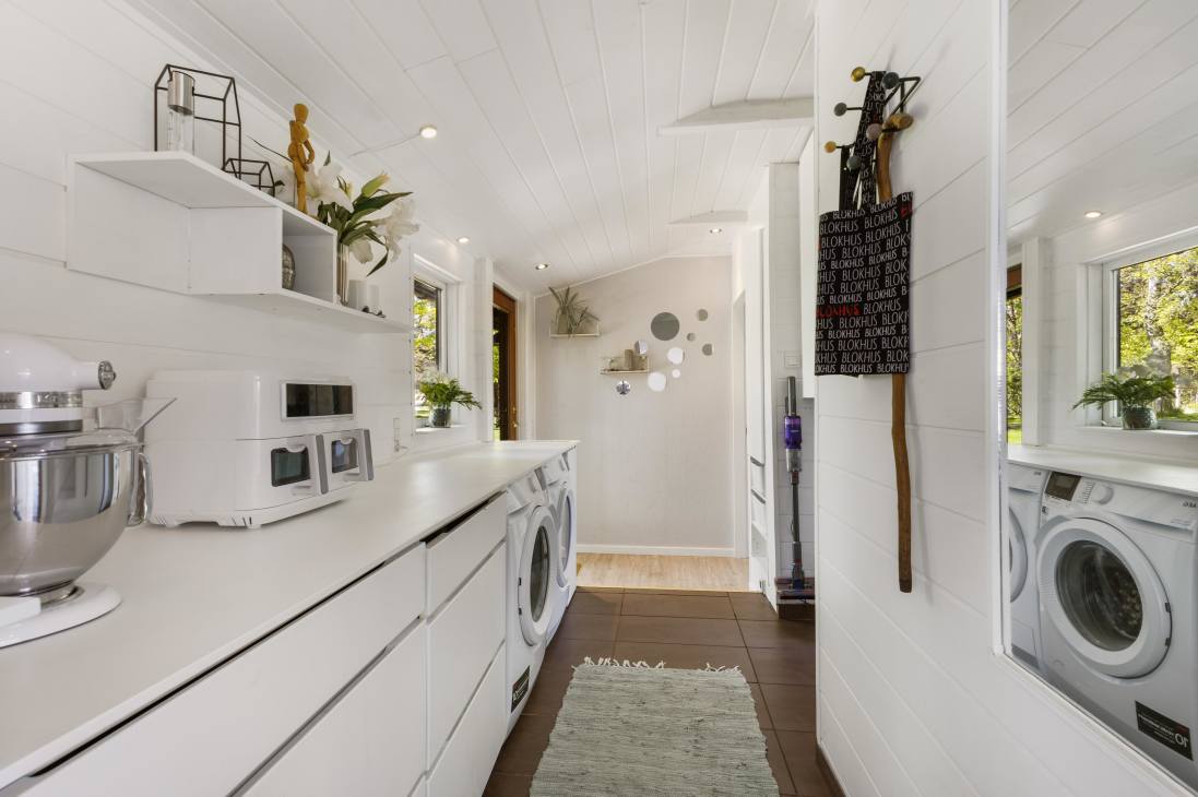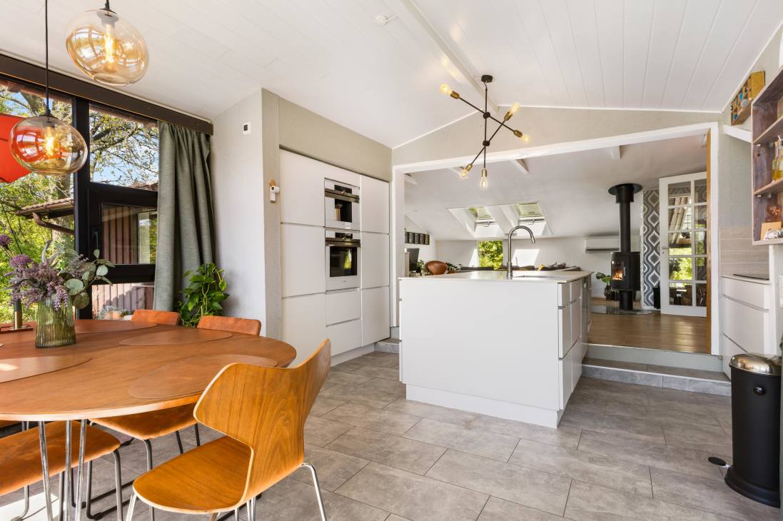 In diesem schönen Ferienhaus findest du versetzte Ebenen, Seele und Charme! Der Hauseigentümer hat das Ferienhaus wirklich individuell gestaltet, und man fühlt sich vom ersten Moment an willkommen, wenn man durch die Tür tritt. Hier bekommst du einen Hauswirtschaftsraum in offener Verbindung zu einer großen Küche/Essbereich und Wohnzimmer mit Kamin. Von der Küche aus kannst du durch die großen, hellen Fensterpartien auf die wunderschöne Natur und den versenkten Whirlpool auf einem Teil des großen Terrassenbereichs blicken. Du bekommst 6 Schlafplätze, verteilt auf 3 Schlafzimmer - zwei Doppelbetten und ein Etagenbett.