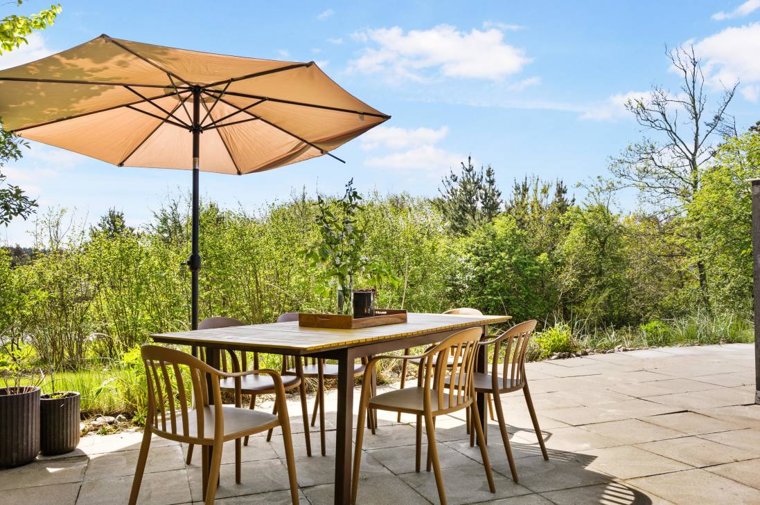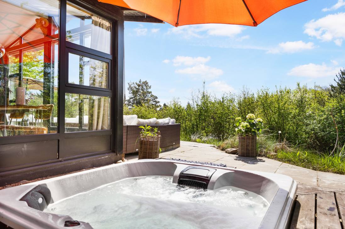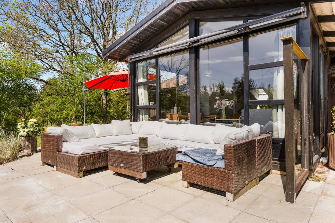 Außerhalb des Hauses gibt es einen großen Terrassenbereich mit Außenwhirlpool und Grill - so kann man hier viele Stunden verbringen und den dänischen Sommer entweder im Loungebereich, auf den weichen Sofas, in den gemütlichen Stühlen oder am Essplatz genießen.