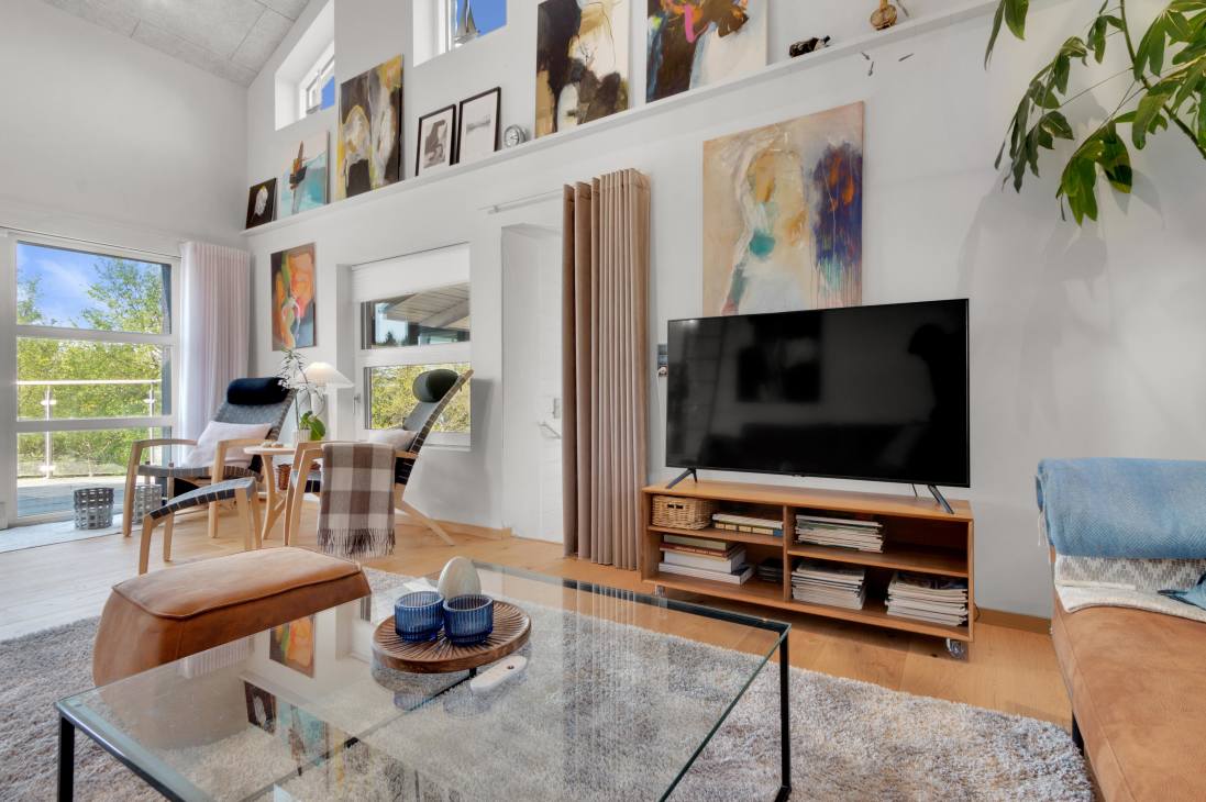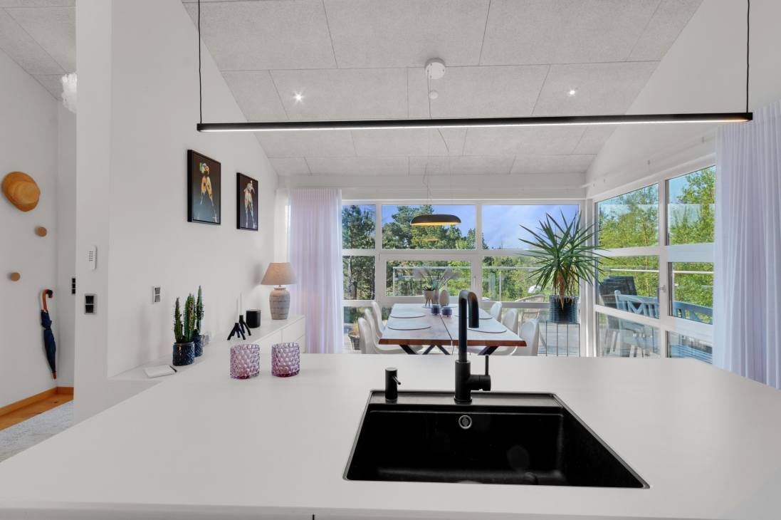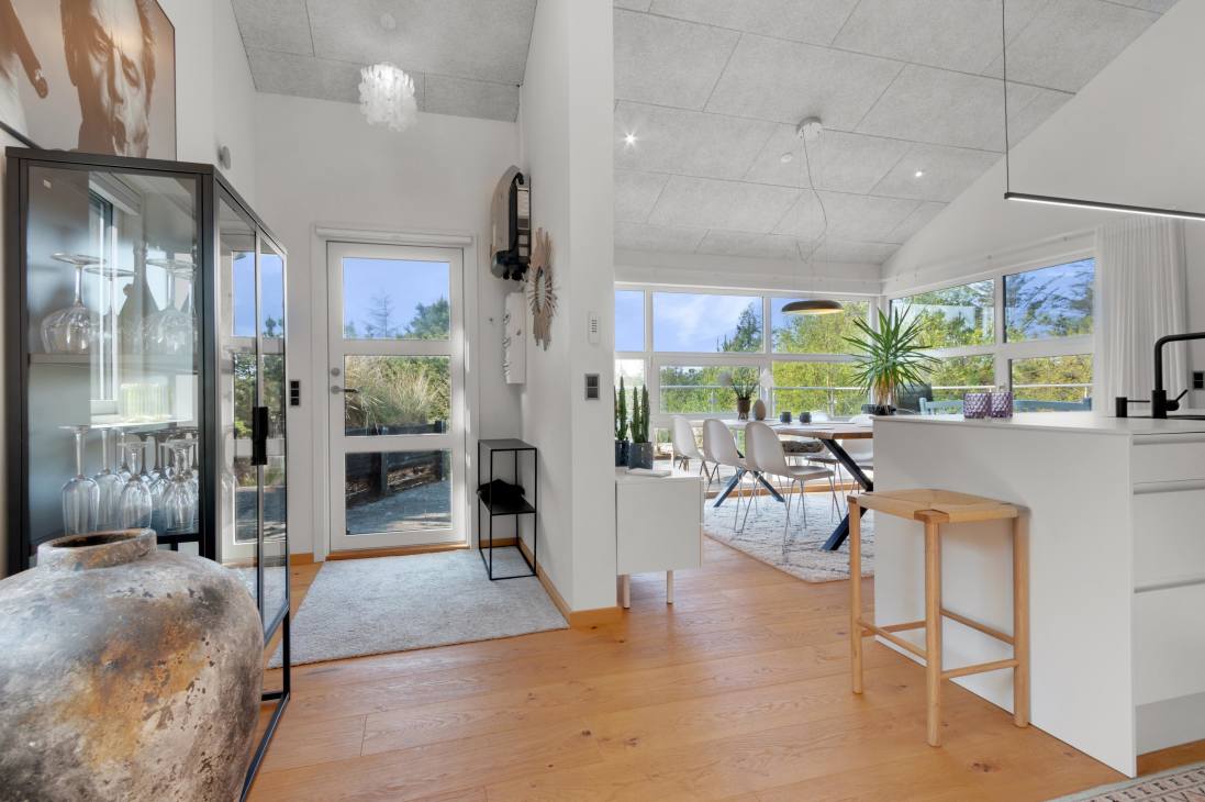 ..yes, here lies a house so beautiful! This holiday home is really luxurious and it is nicely secluded from the road. You might catch a glimpse of it when you see the mailbox for Krylevej 10, but you still need to go a little further in and to the right before the house proudly stands out on a higher level. The road from the mailbox past number 12 belongs to the summer house's plot area. The fact that the house is on a high ground also means that you have to walk up a charming staircase that follows the hill on which the house is built.