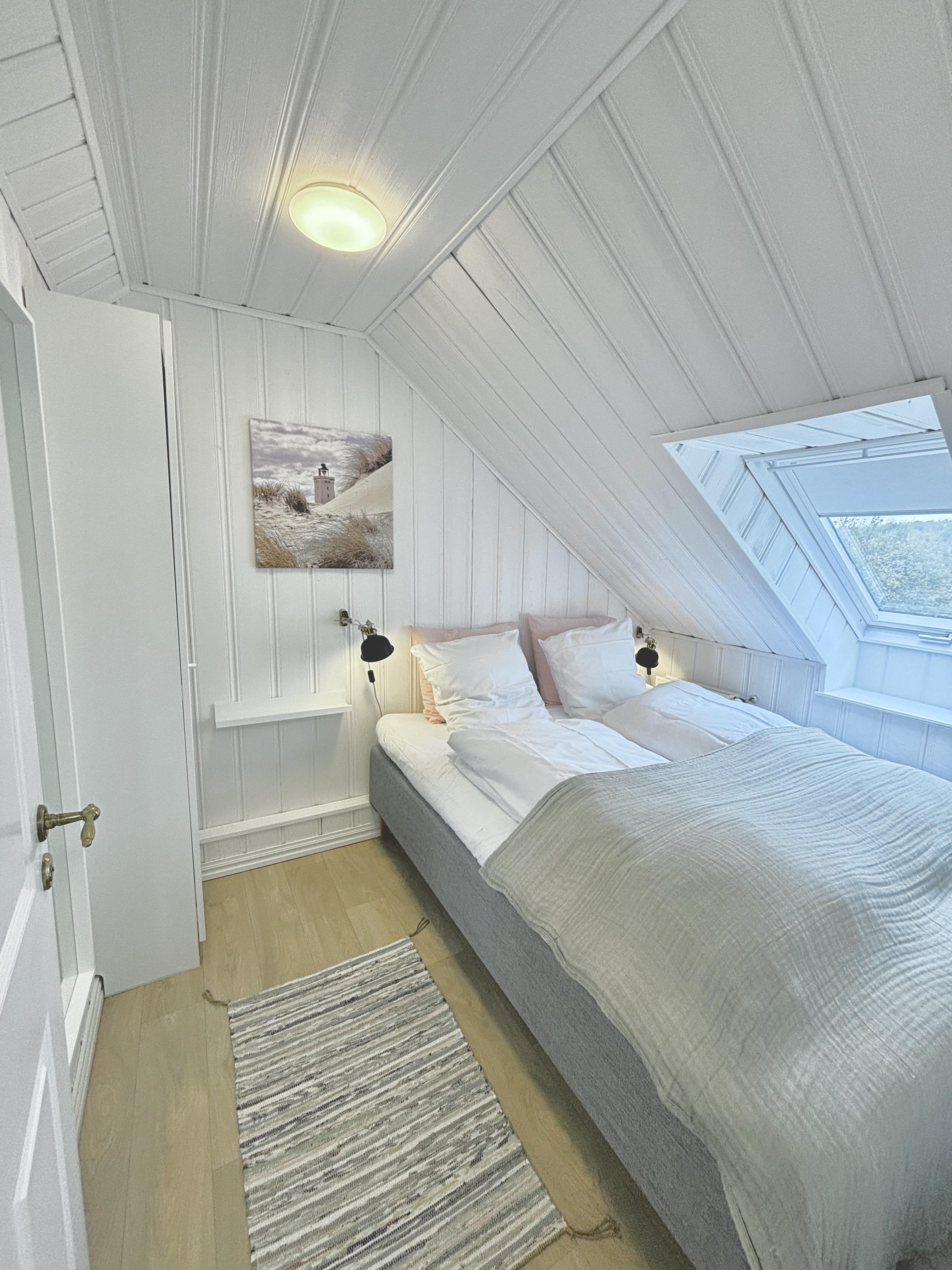 Høloftet is furnished with a focus on modern conveniences while preserving the charm of slanted walls and hayloft. The two bedrooms offer comfortable beds, ensuring a good night's sleep after a day of activities in the area.