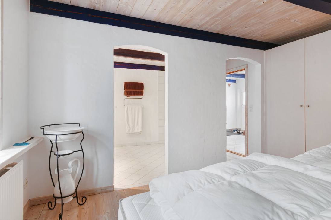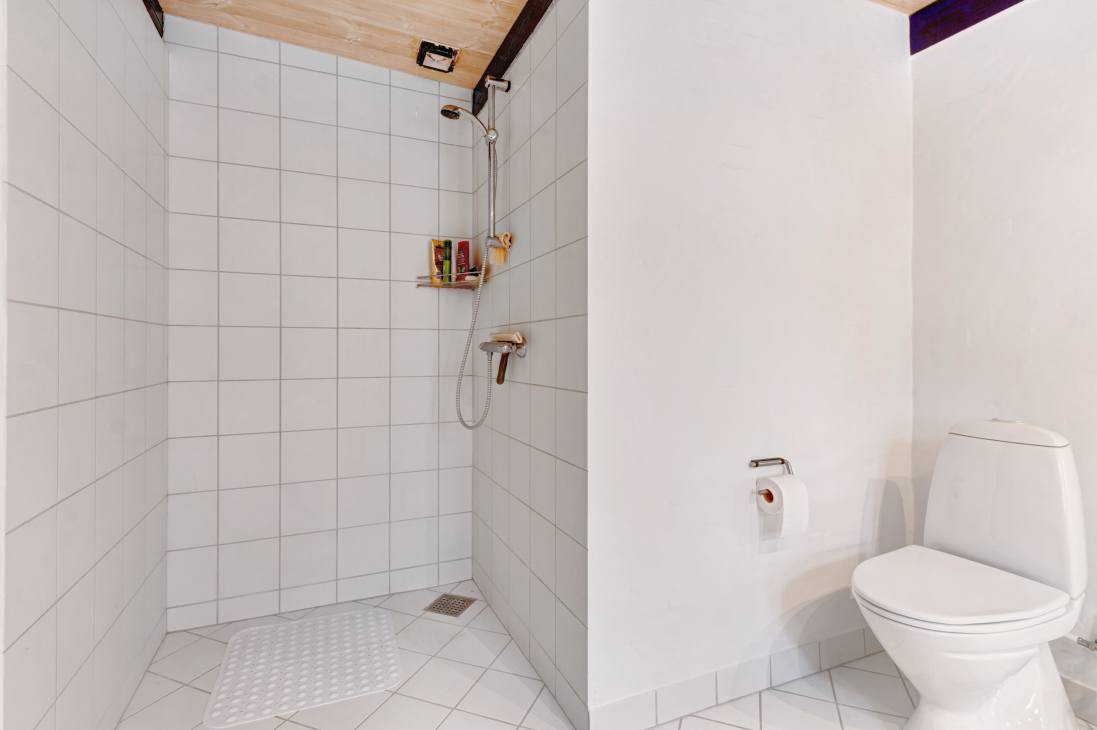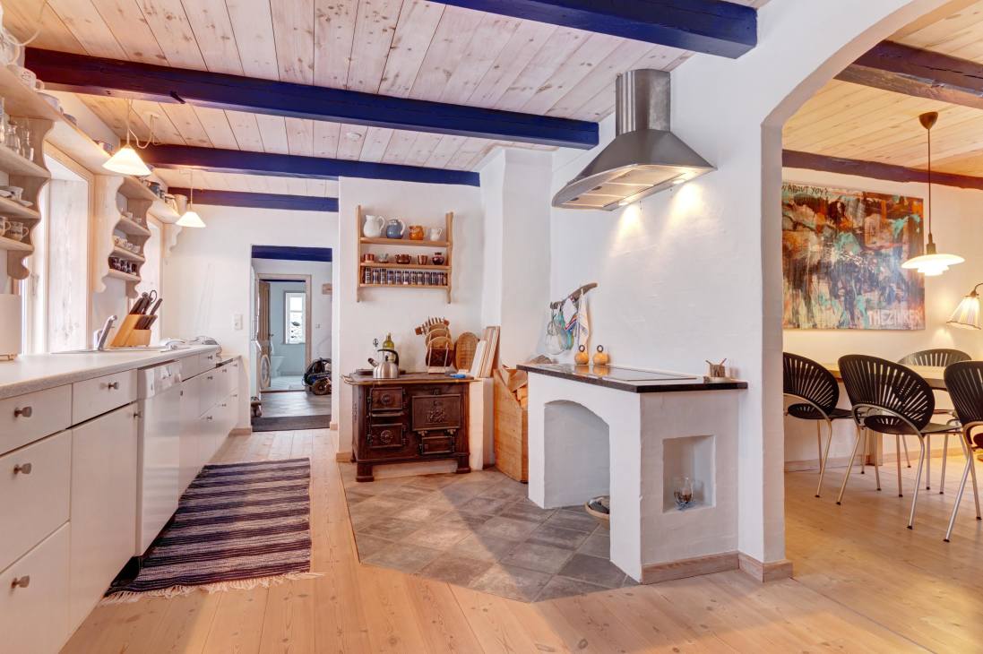 When you enter through the front door of this lovely holiday home, you find yourself in the house's large entrance hall with access to a large and lovely bathroom, two bedrooms, and a large kitchen. In the kitchen, you'll find the most beautiful, old-fashioned wrought iron wood stove, and the room is generally kept in a super charming style that invites coziness. In open connection from the kitchen, you can access the house's large living room as well as the third bedroom and the house's second bathroom. From the kitchen, you can also access the outdoor terrace that surrounds the house.