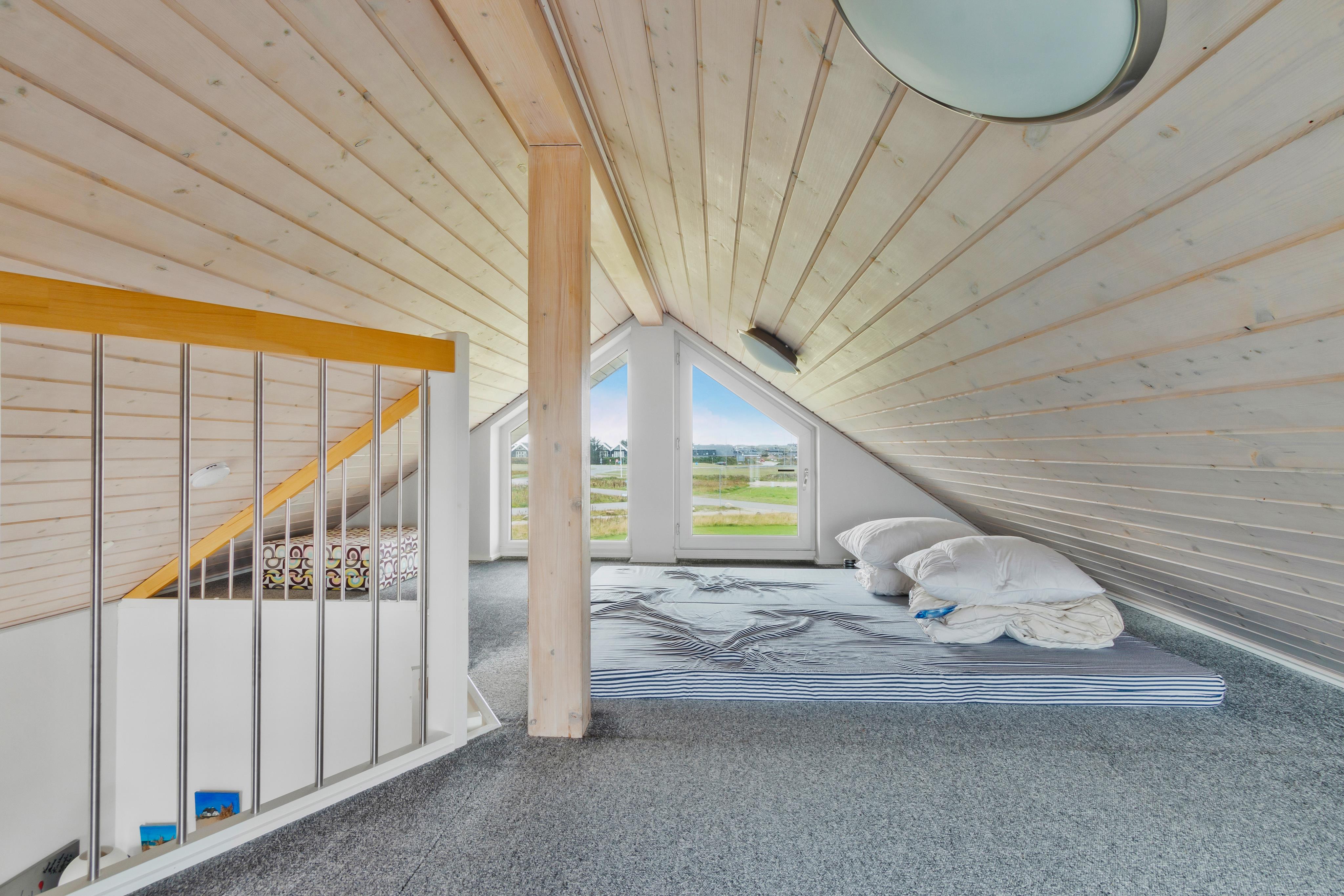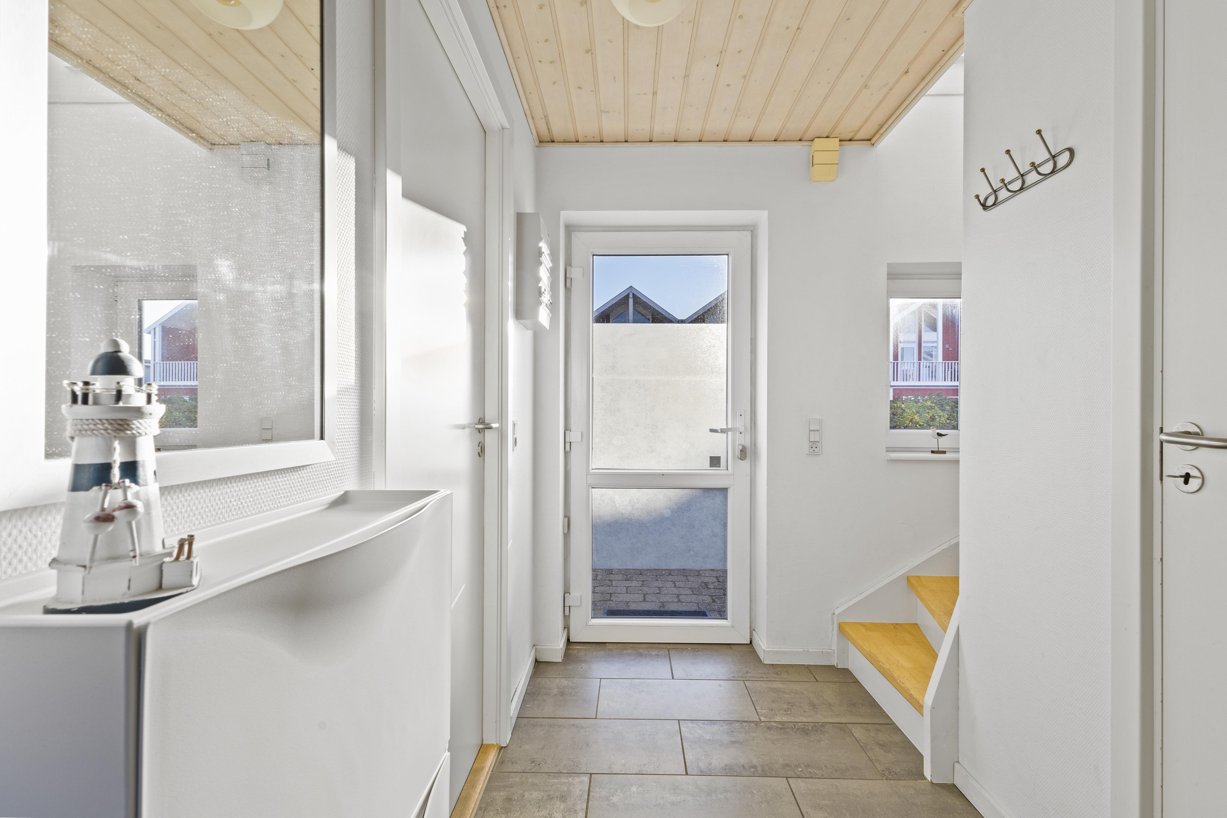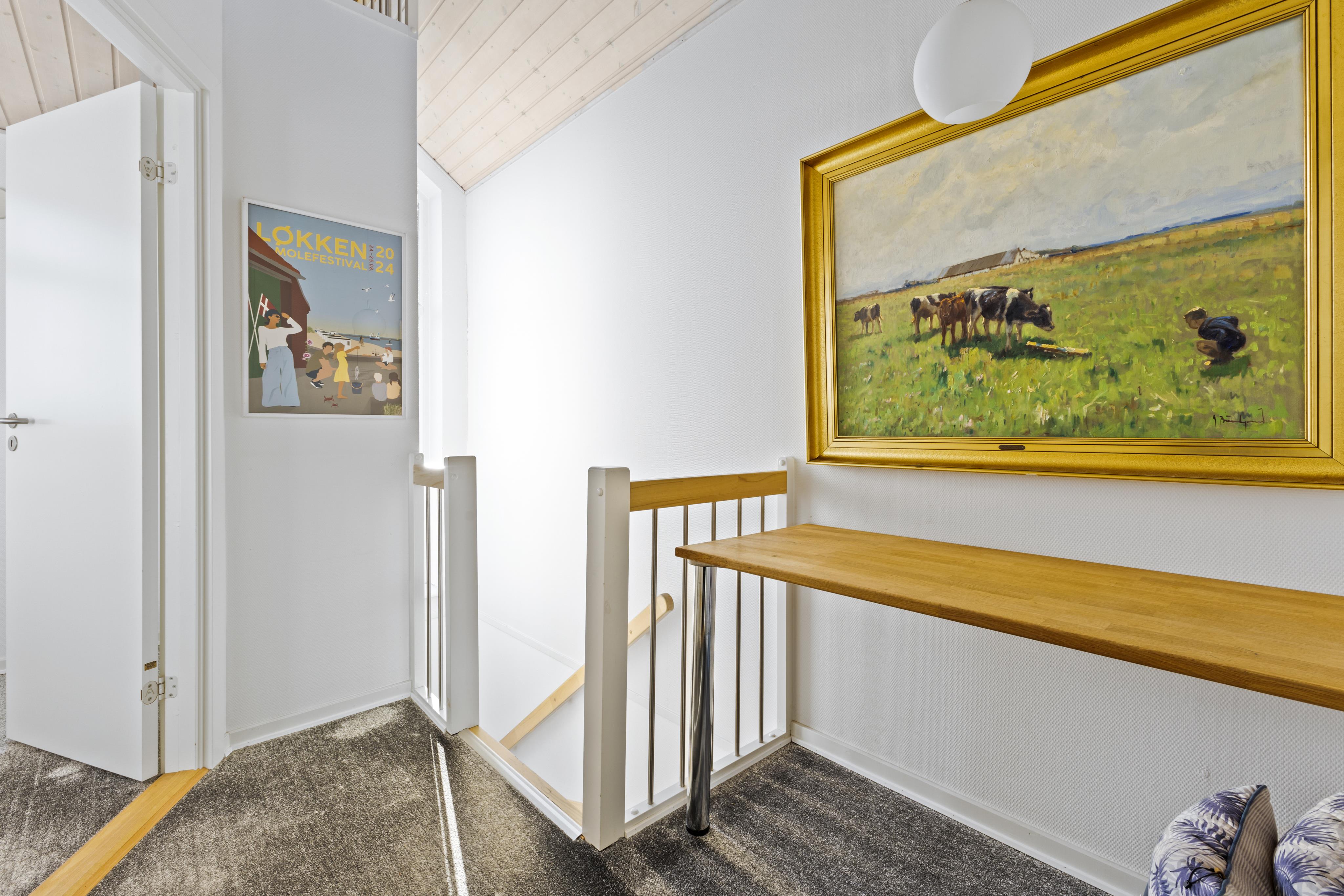 The holiday home is situated side by side with the other characteristic two-story houses in a secluded neighborhood, which means there is no heavy traffic or the like. About 1.2 kilometers to the beach and 500 meters to shopping options and Løkken town center.