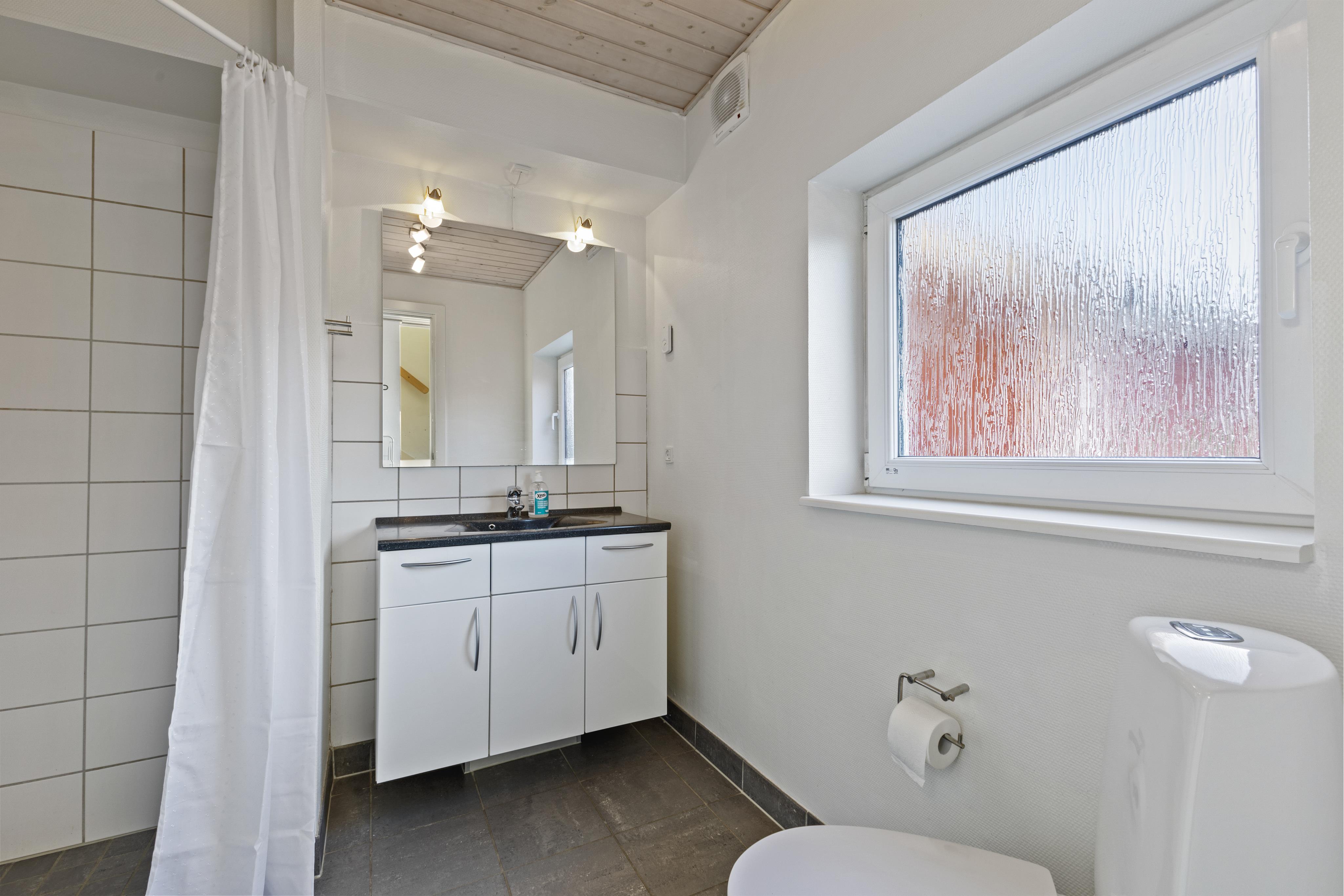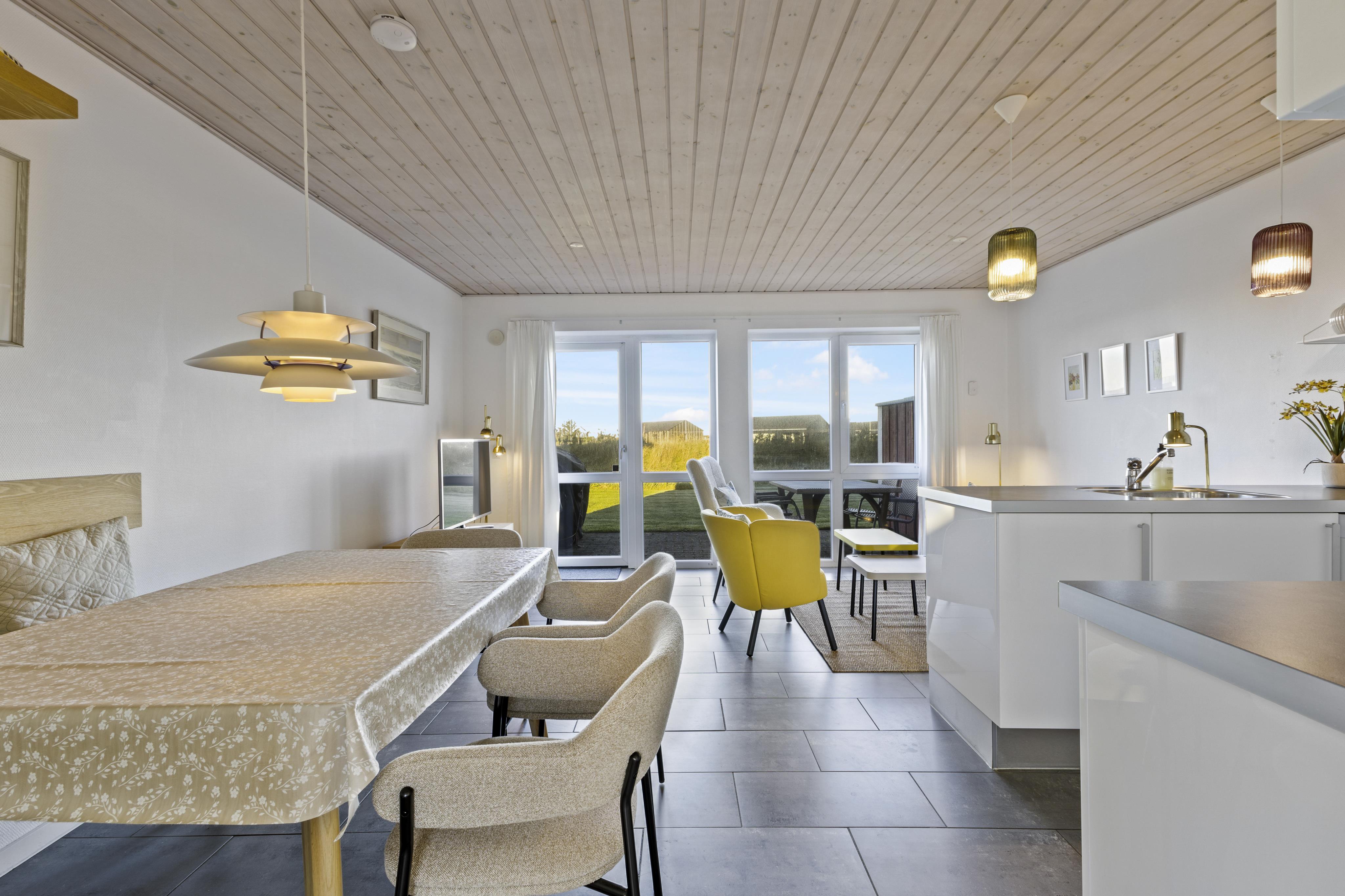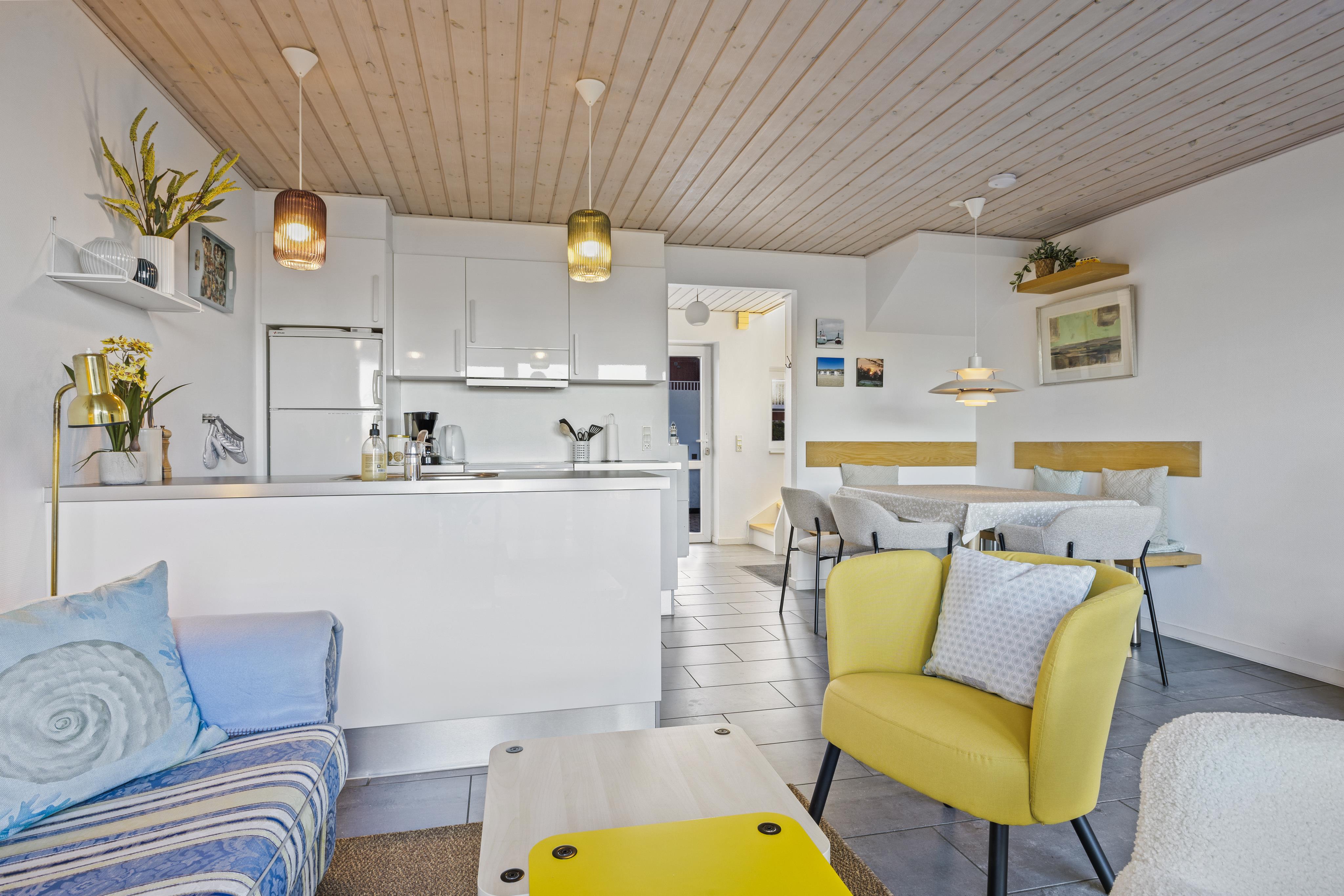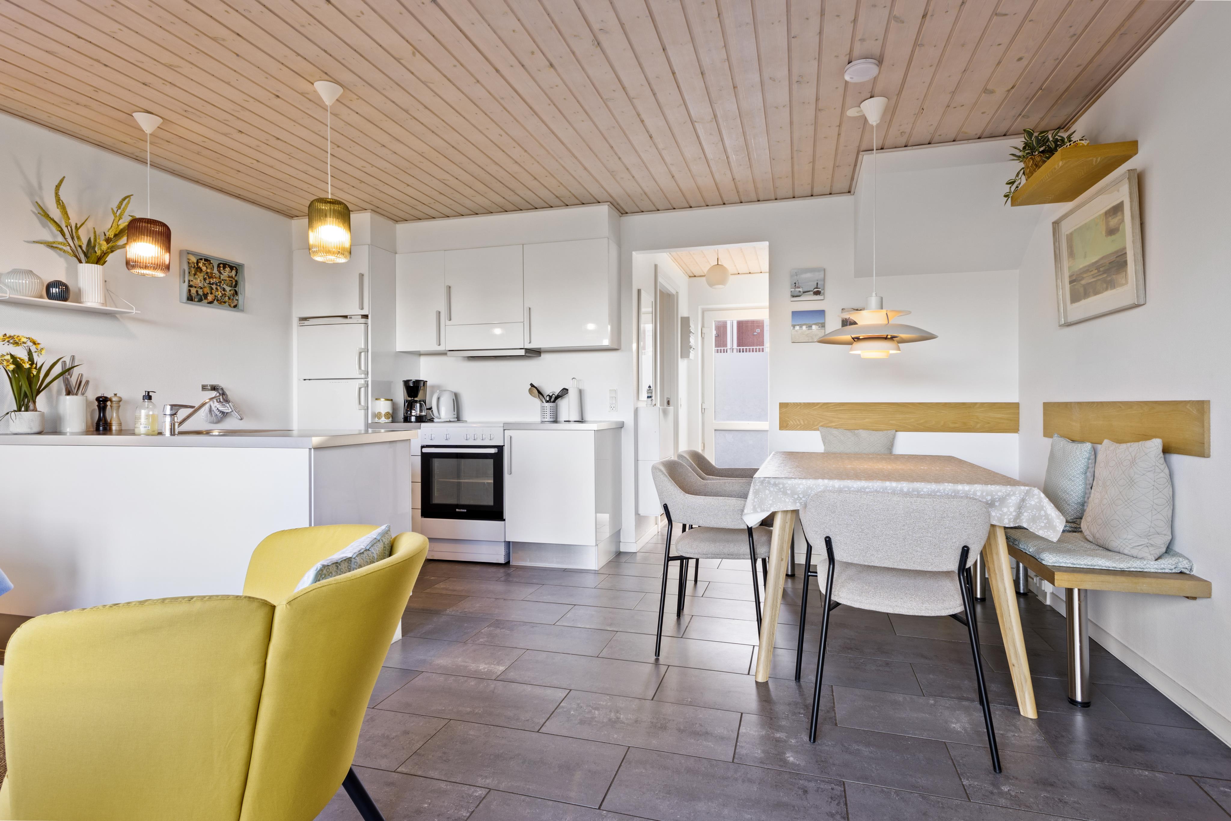 The holiday home is situated side by side with the other characteristic two-story houses in a secluded neighborhood, which means there is no heavy traffic or the like. About 1.2 kilometers to the beach and 500 meters to shopping options and Løkken town center.