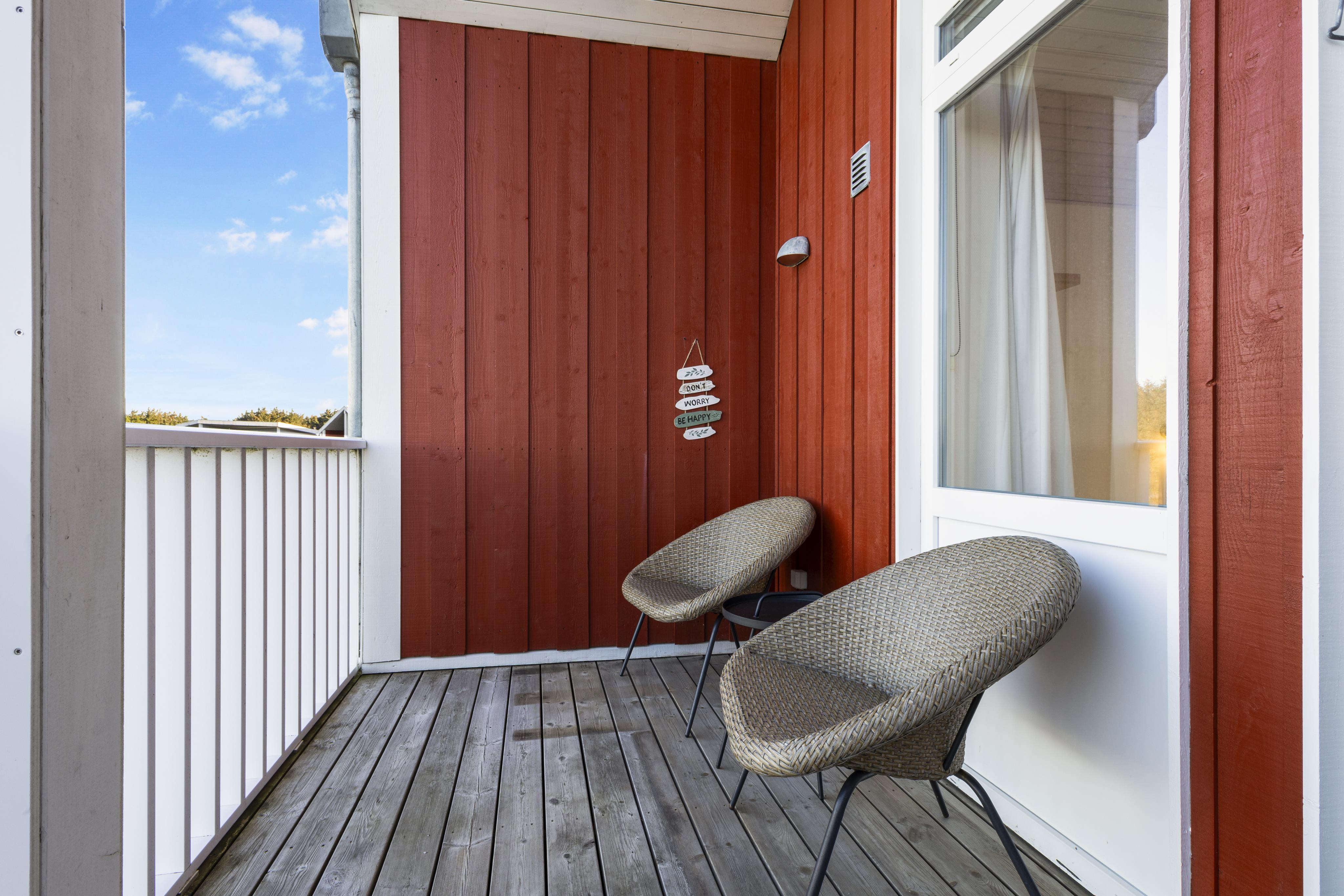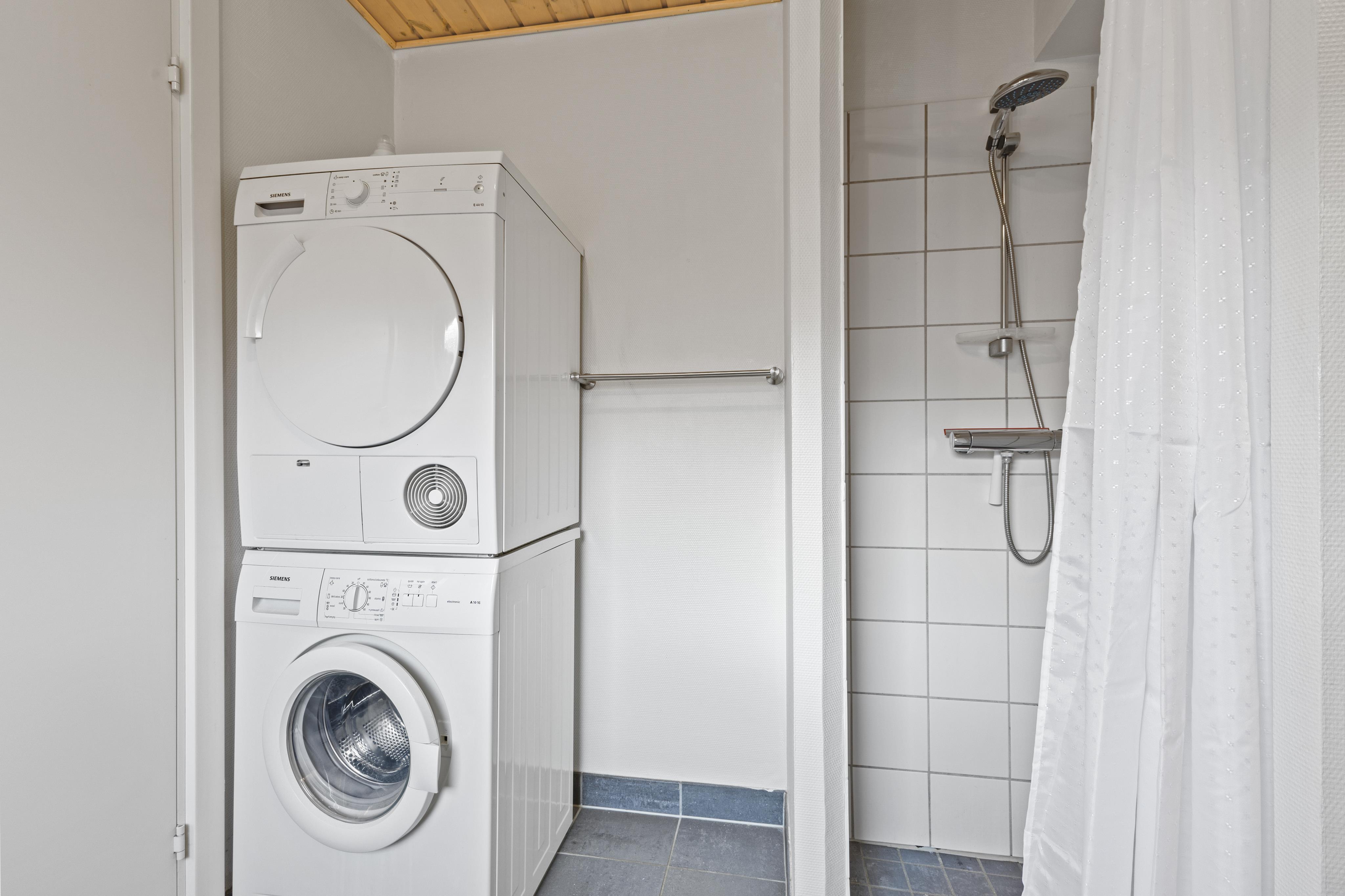 The house welcomes you inside the cozy entrance, where the staircase leads you up to the 1st floor, and the hallway leads you to the bathroom with a washing machine and dryer. From the hallway, you can also access the bright kitchen/dining area/living room, from where you can step out onto the holiday home's terrace and lawn. On the 1st floor, there are two bedrooms, both with access to the lovely balcony, which overlooks the area's soccer field, as well as access to the loft with two mattresses.