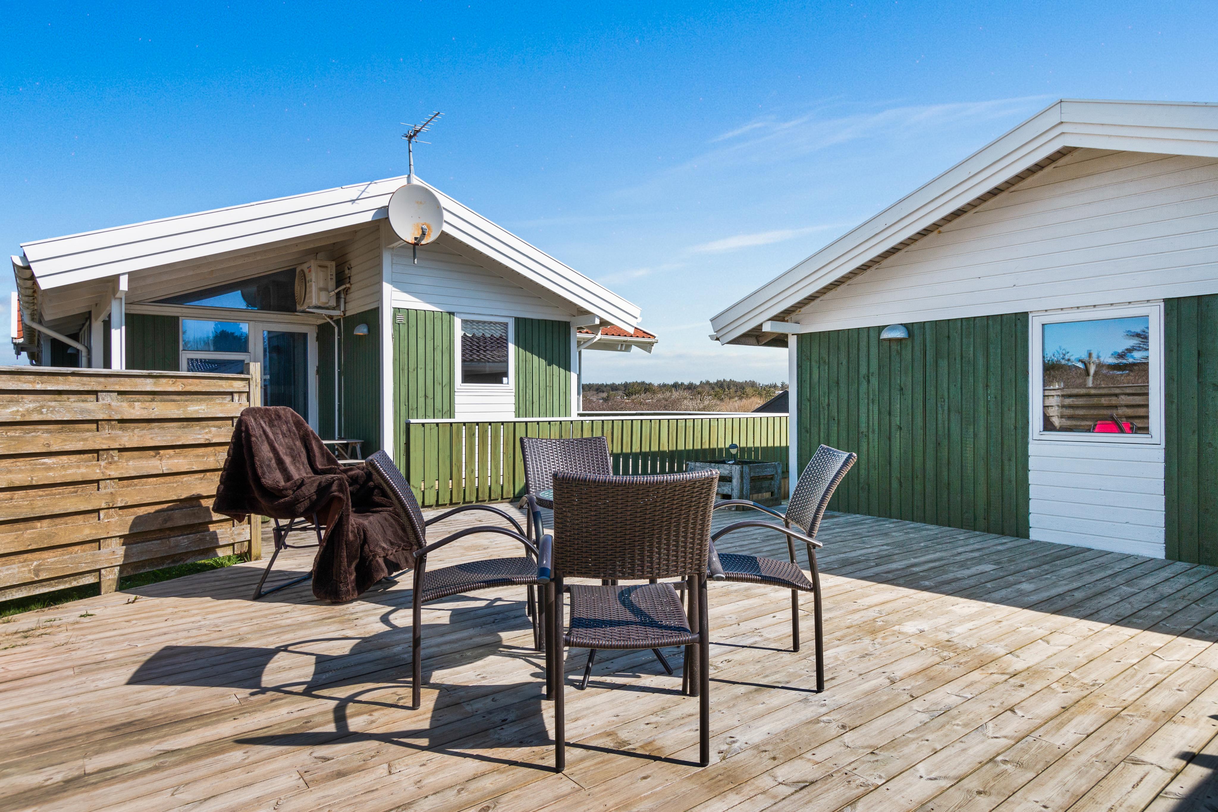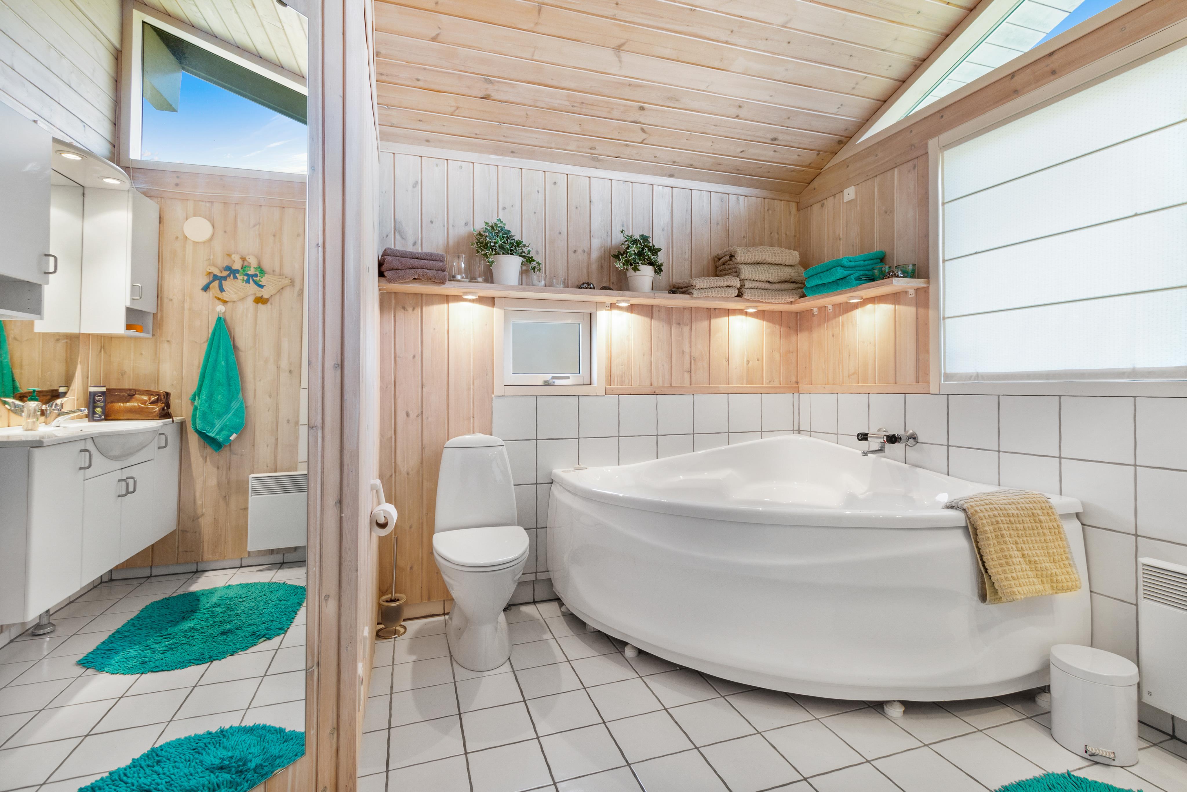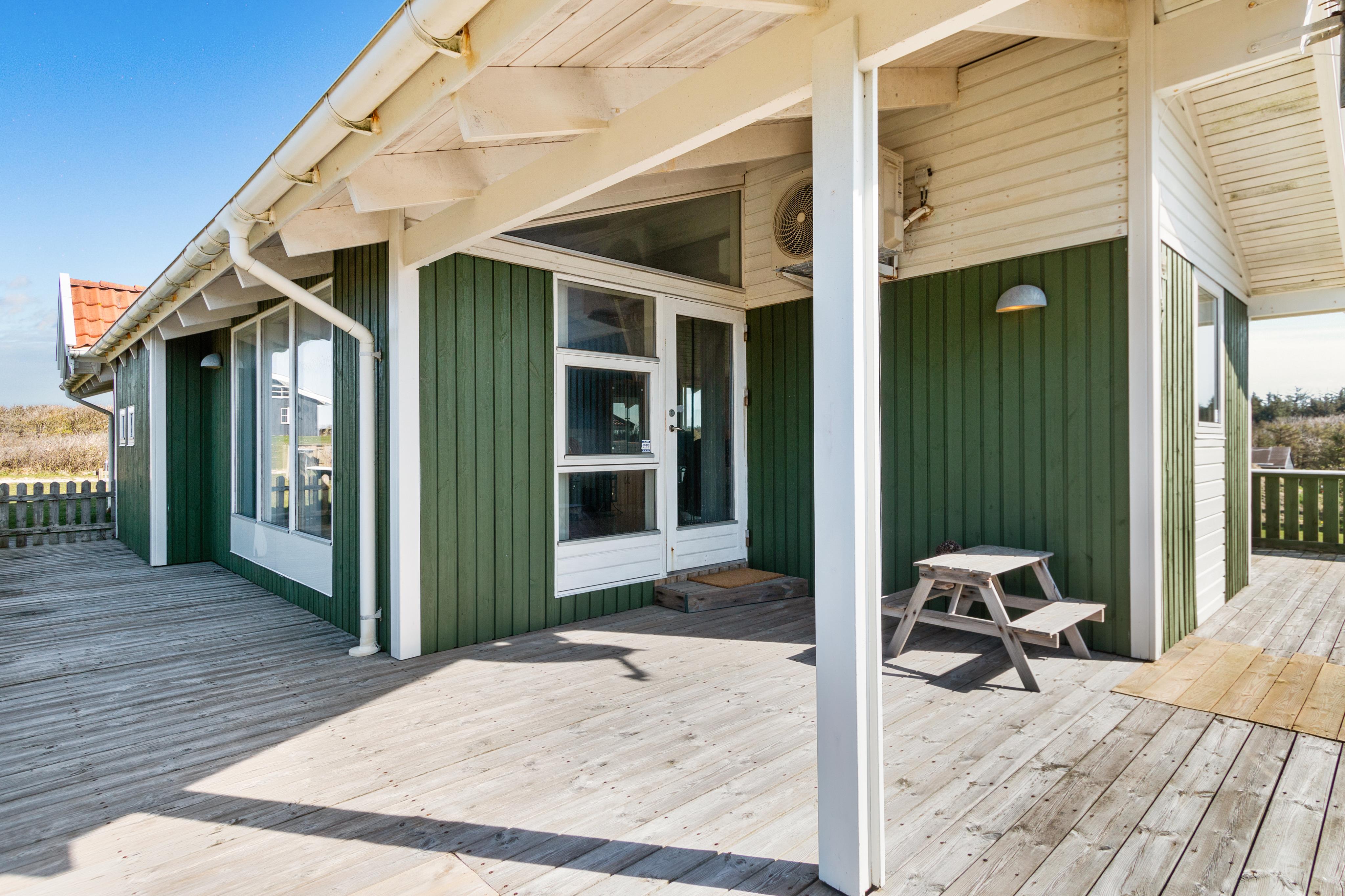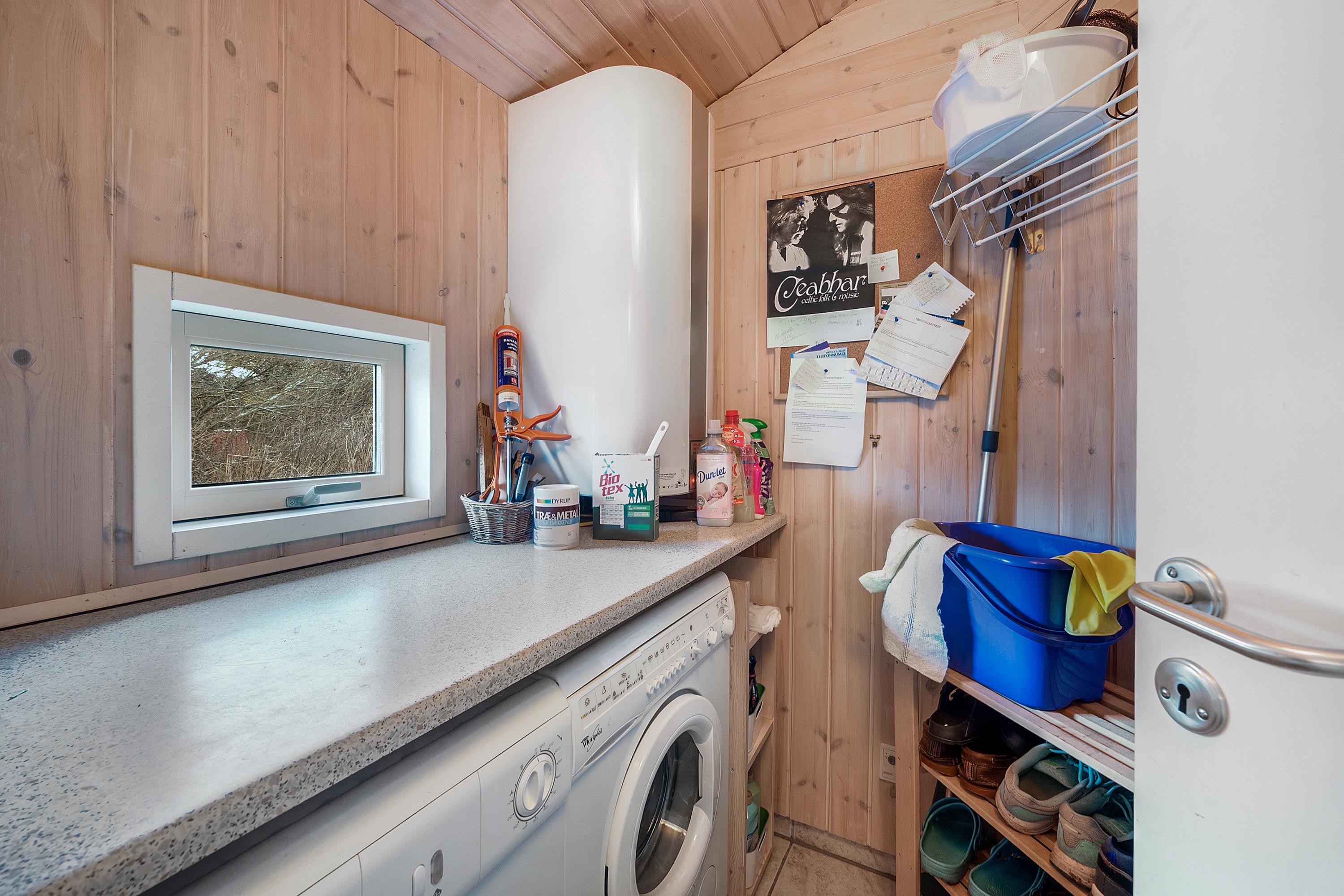 As mentioned, the summer house is 91 square meters and in really nice condition. It exudes a genuine holiday atmosphere like a traditional holiday home. It is practically furnished with a utility room and 5 sleeping places. Just as you enter the house, there is access to a lovely bathroom on the left, which includes a separate shower and a spa. Continuing straight ahead, you will enter the second bathroom. There are three bedrooms and two bathrooms - practically furnished with plenty of space for 7 people. Lovely open kitchen/dining/living room with wood-burning stove and a utility room with washing machine and dryer. The living room in the summer house is a fantastic place to stay. There is plenty of space and natural light streaming in through the large windows, and there is direct access to the terrace. The summer house was built in 2000, and the facade consists of green and white painted woodwork, which, like the rest of the holiday home, exudes a holiday atmosphere. The plot is spacious with plenty of garden space and a large terrace.
