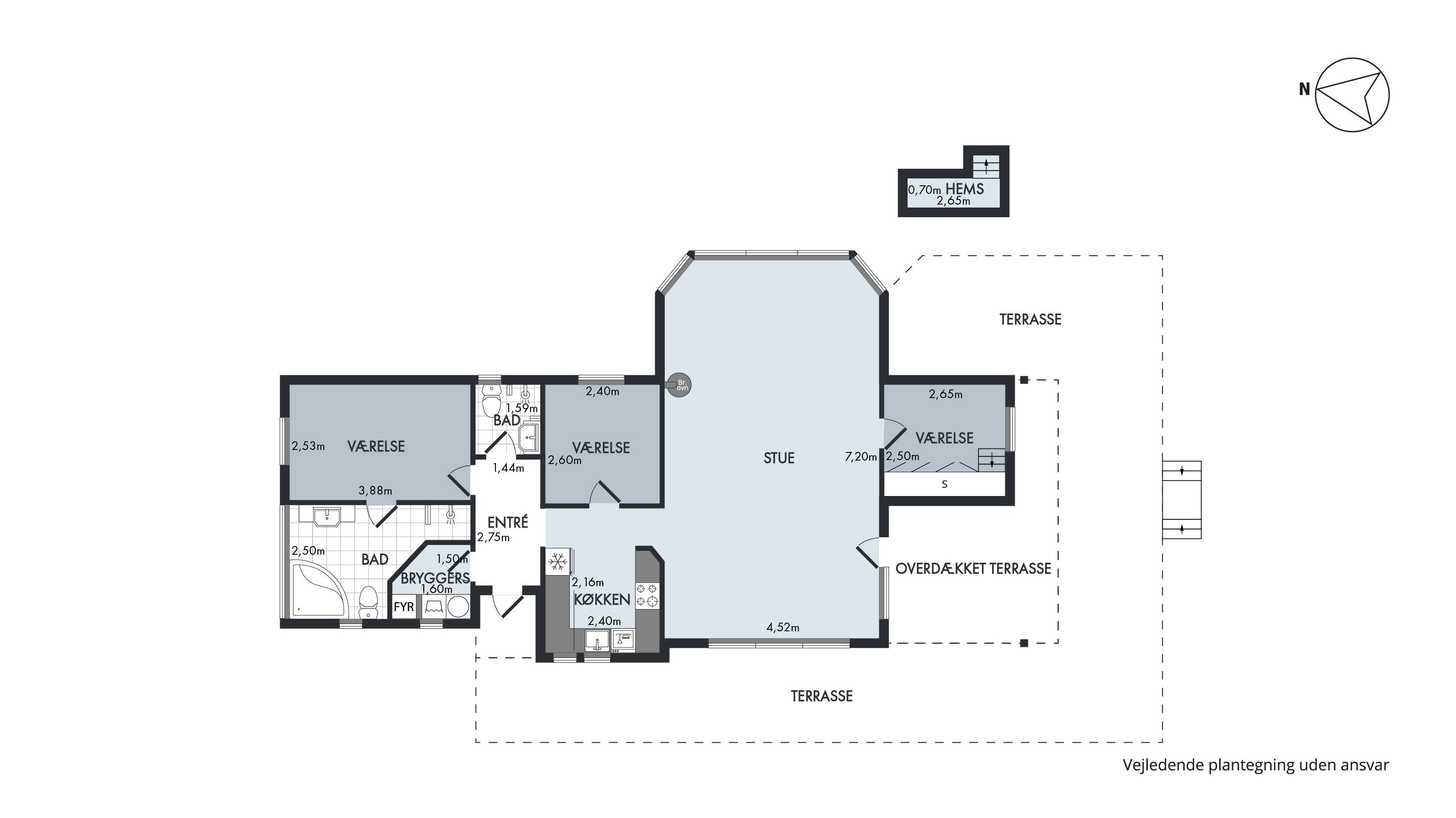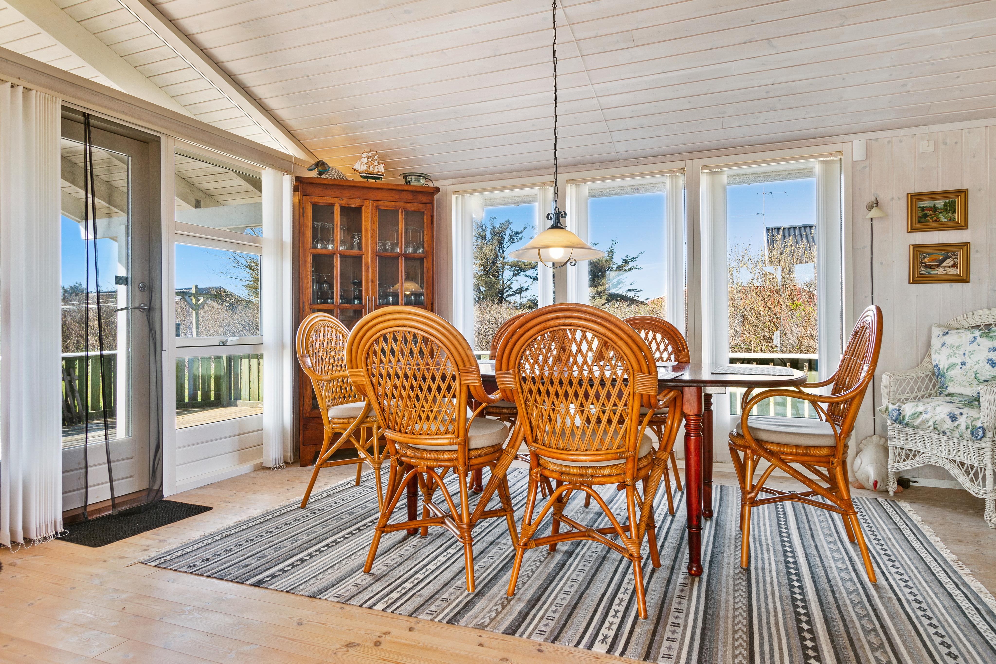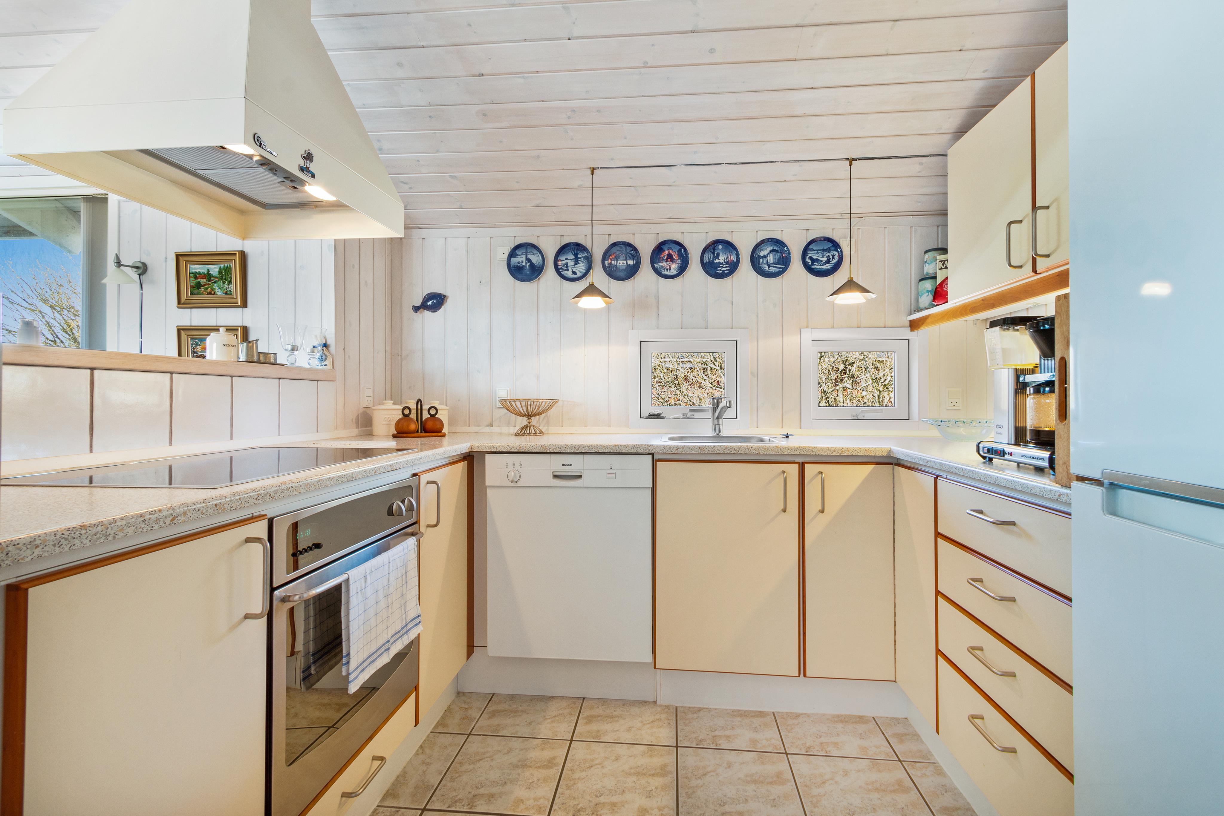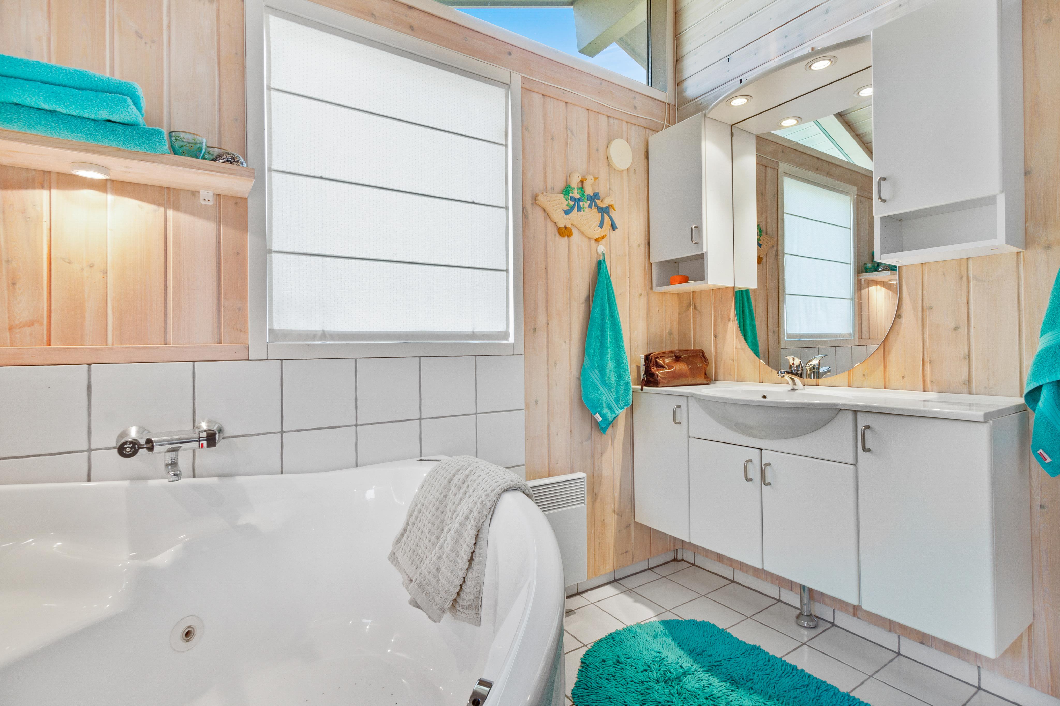 As mentioned, the summer house is 91 square meters and in really nice condition. It exudes a genuine holiday atmosphere like a traditional holiday home. It is practically furnished with a utility room and 5 sleeping places. Just as you enter the house, there is access to a lovely bathroom on the left, which includes a separate shower and a spa. Continuing straight ahead, you will enter the second bathroom. There are three bedrooms and two bathrooms - practically furnished with plenty of space for 7 people. Lovely open kitchen/dining/living room with wood-burning stove and a utility room with washing machine and dryer. The living room in the summer house is a fantastic place to stay. There is plenty of space and natural light streaming in through the large windows, and there is direct access to the terrace. The summer house was built in 2000, and the facade consists of green and white painted woodwork, which, like the rest of the holiday home, exudes a holiday atmosphere. The plot is spacious with plenty of garden space and a large terrace.