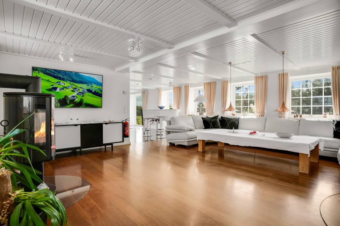 The whole house has underfloor heating, and the indoor climate is kept pleasant with a modern ventilation system that ensures warmth without draught. The living and dining rooms include a dining area, chairs, and built-in TV. The lounge has large glass panels, which provide beautiful natural light and direct access to the terrace. In addition, there are three wood-burning stoves, six TVs, and a hall with dining space for up to 40 people – ideal for larger gatherings.