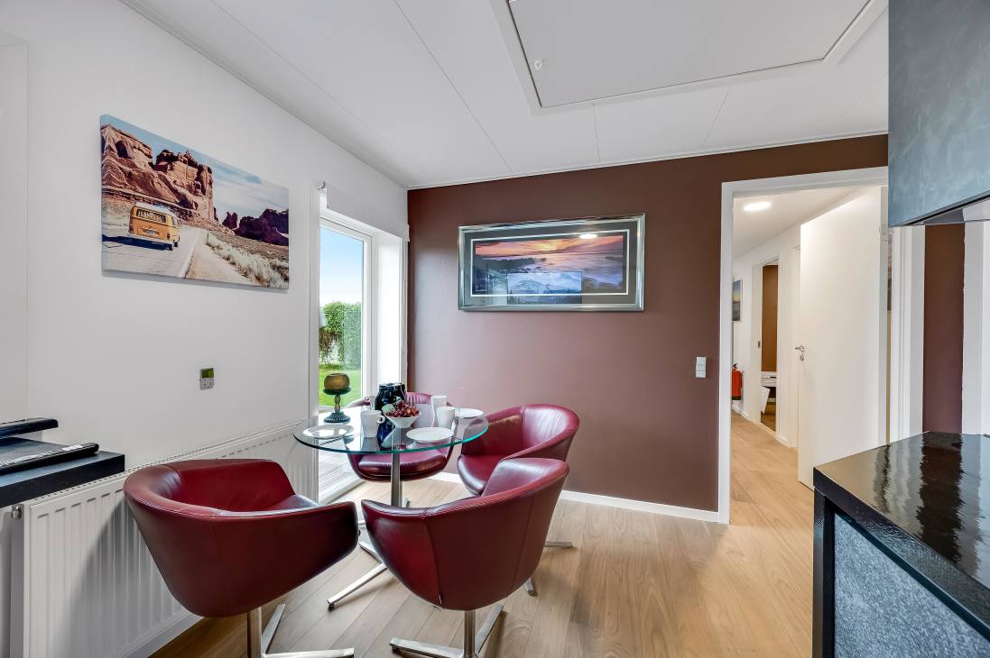 The entire property consists of the wing connected to the main house, with its own entrance and patio door. The four rooms are furnished with lovely, new double beds from Høie; three of the bedrooms feature wall-mounted TVs, and one has a patio door leading out to the courtyard. All rooms have windows overlooking the beautiful outdoor area. Bed sizes are: 2×180 cm, 150 cm, and 120 cm, plus a bunk bed. The rooms are all of a good, functional size, and the shared facilities cover a full 120 m². Altogether, the wing measures around 160 m².