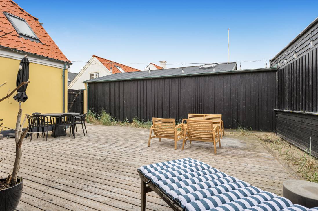 Mit 100 Metern zum Strand und 25 Metern zum nächsten Restaurant werden Sie möglicherweise nicht viel Zeit im Ferienhaus oder auf der Terrasse verbringen, aber wenn Sie es tun, ist die Terrasse schön abgeschirmt vom Stadtleben usw. Mit Sitzplätzen für 6 Personen im Essbereich können Sie das Leben im Freien in vollen Zügen genießen! Auf der Terrasse gibt es neben einem Grill auch mehrere Möbel, um sich zu entspannen.