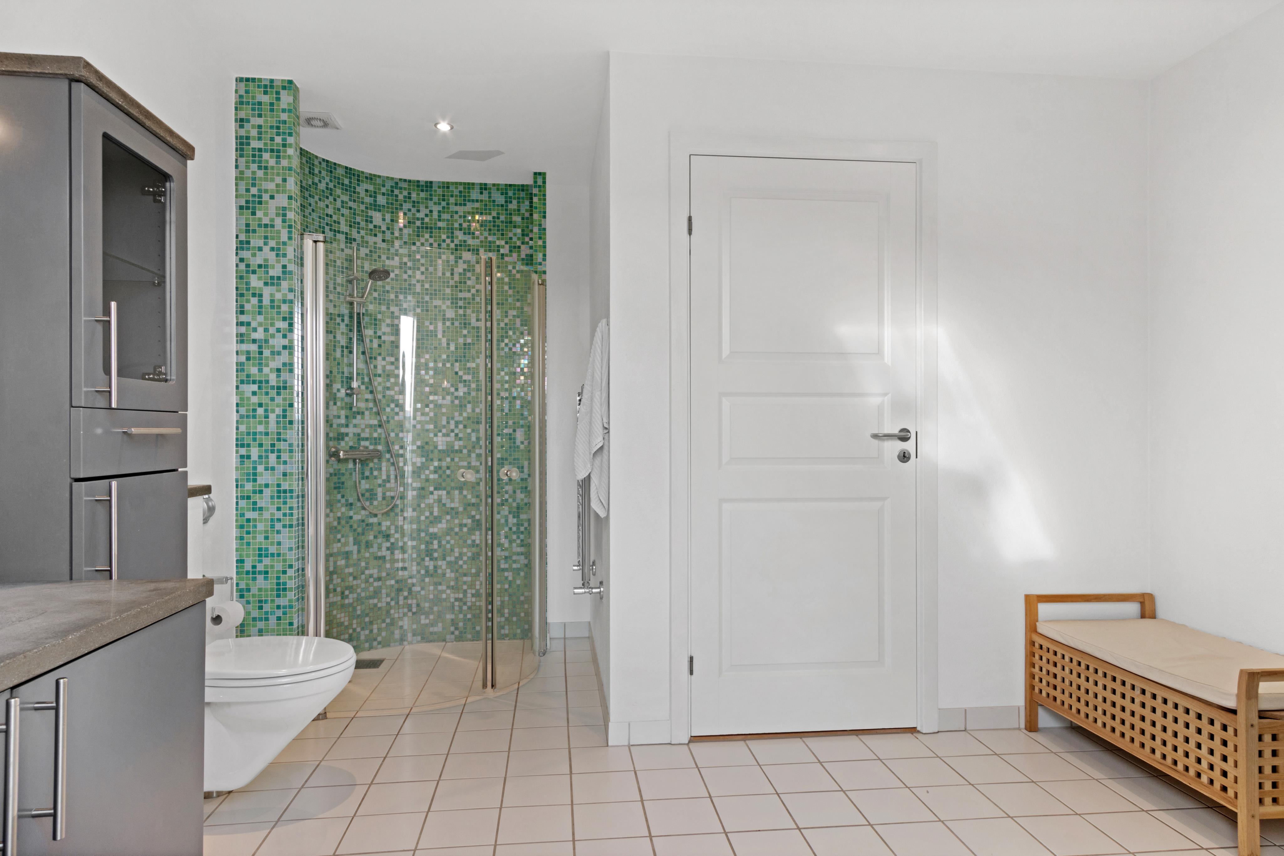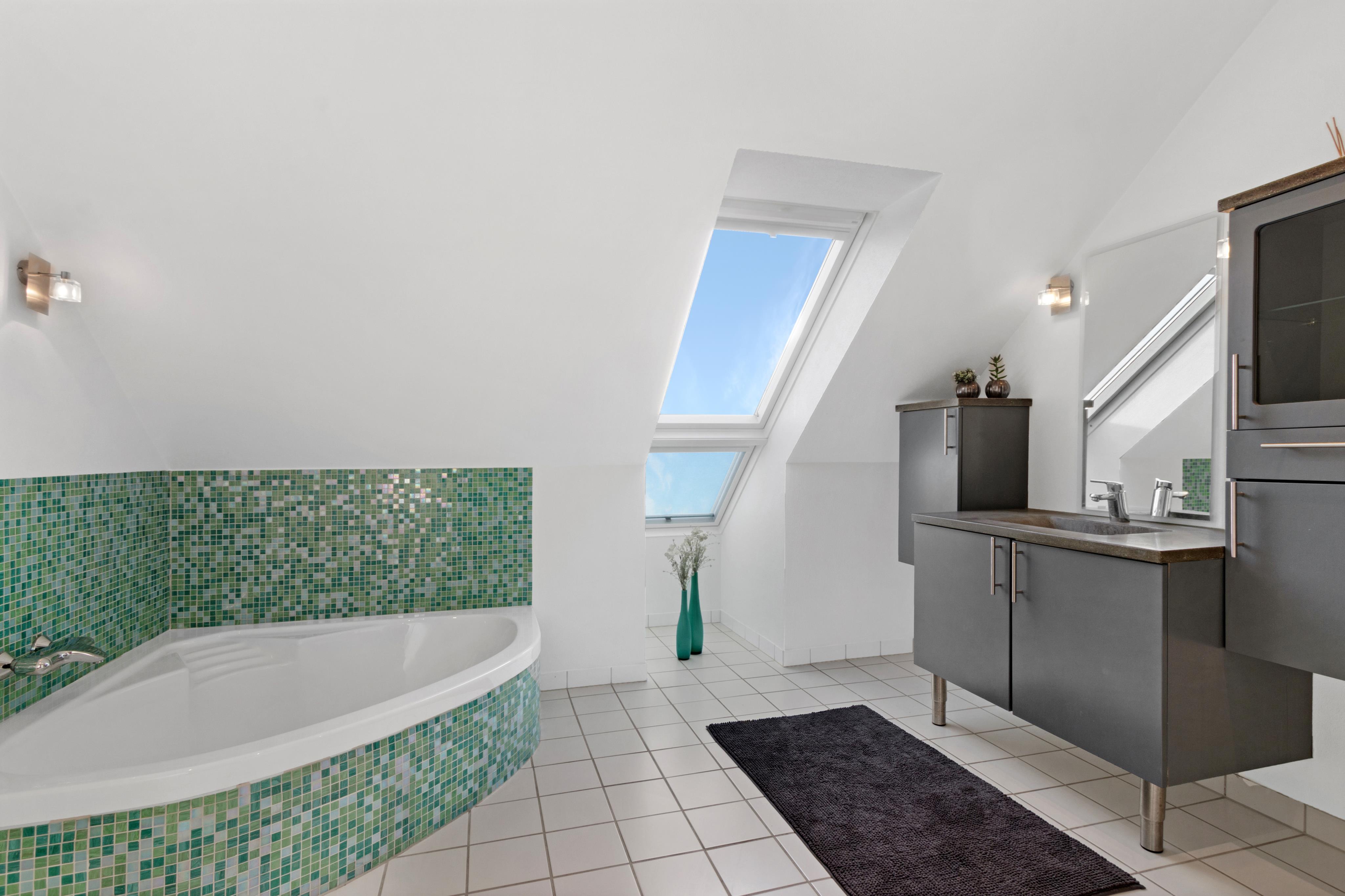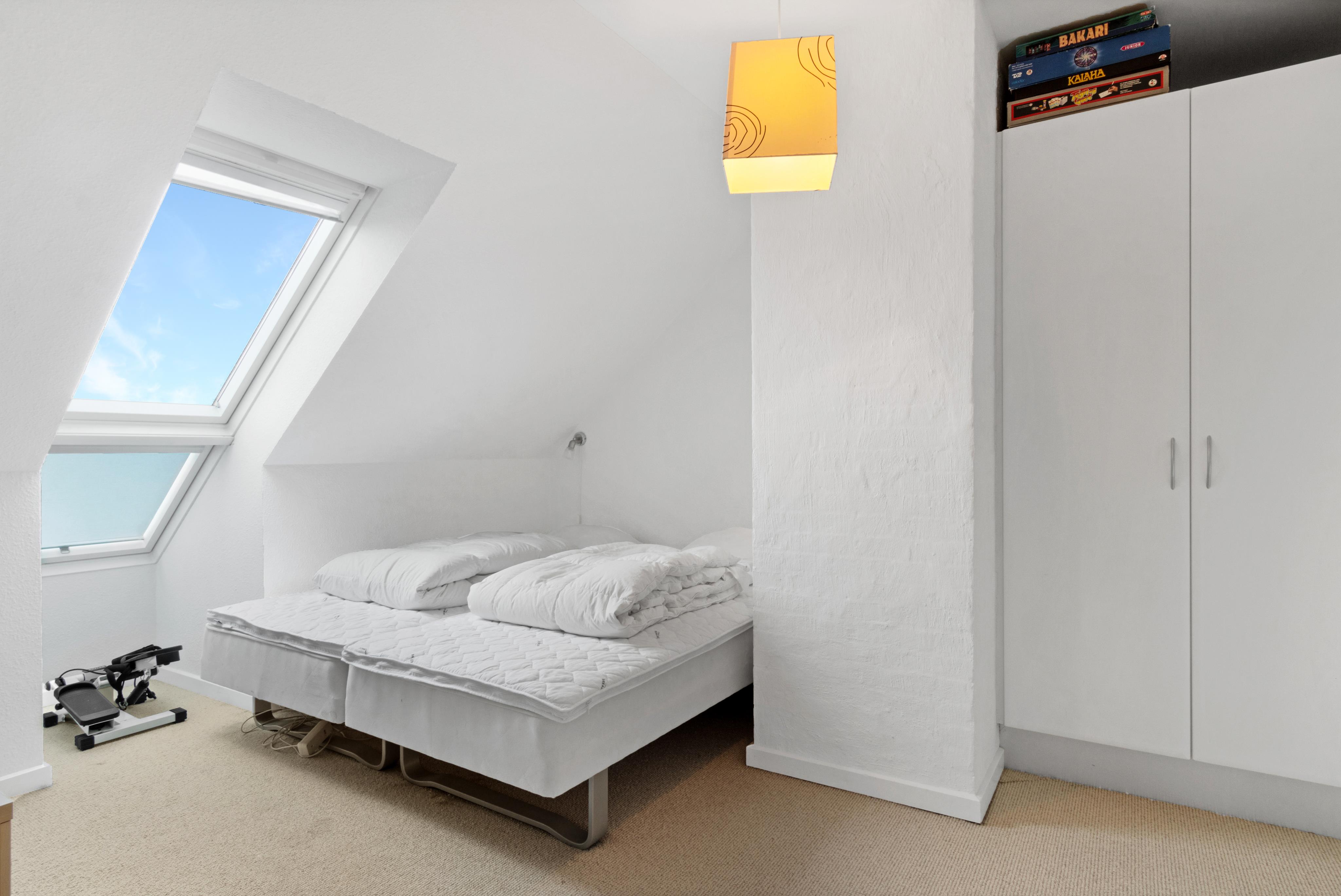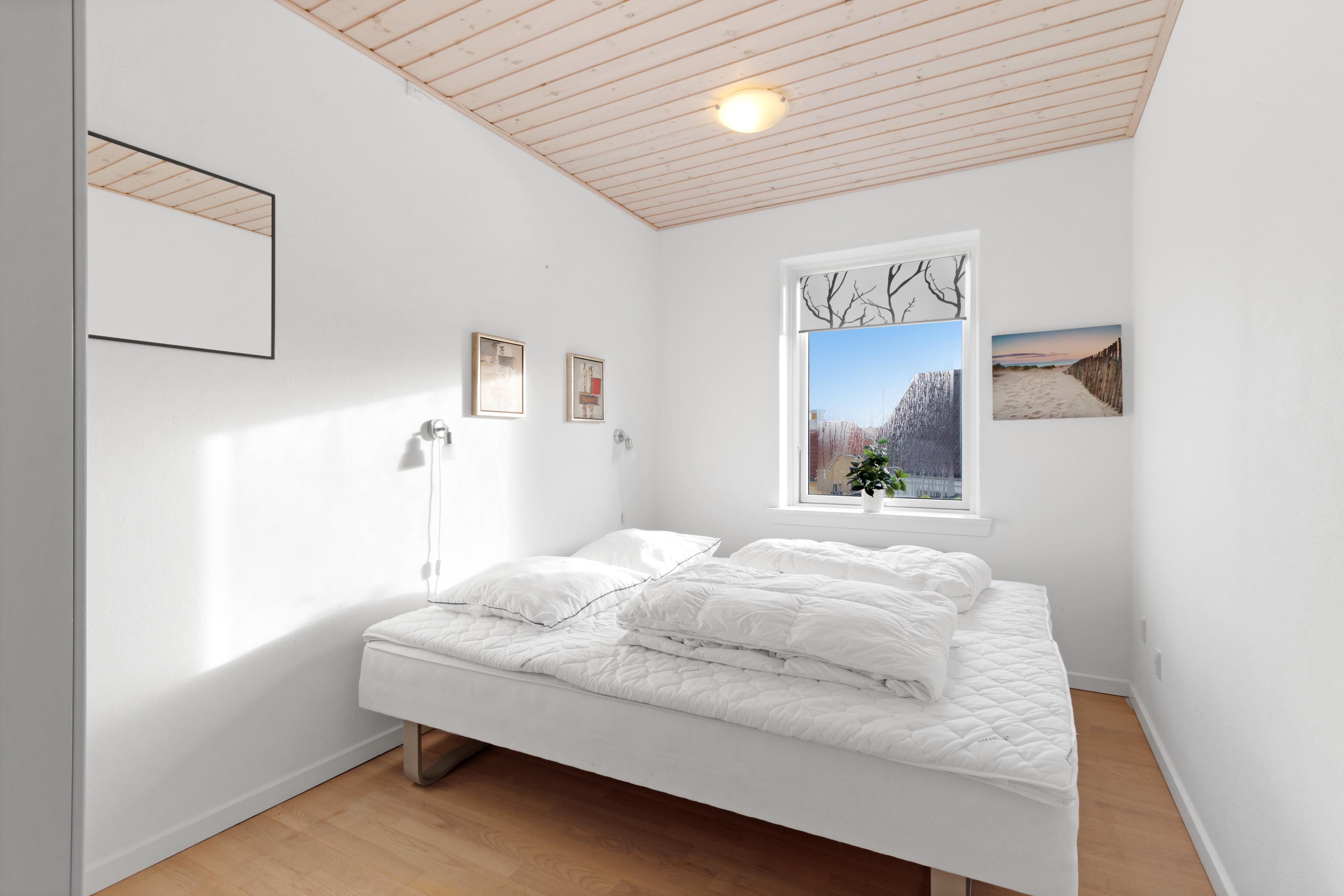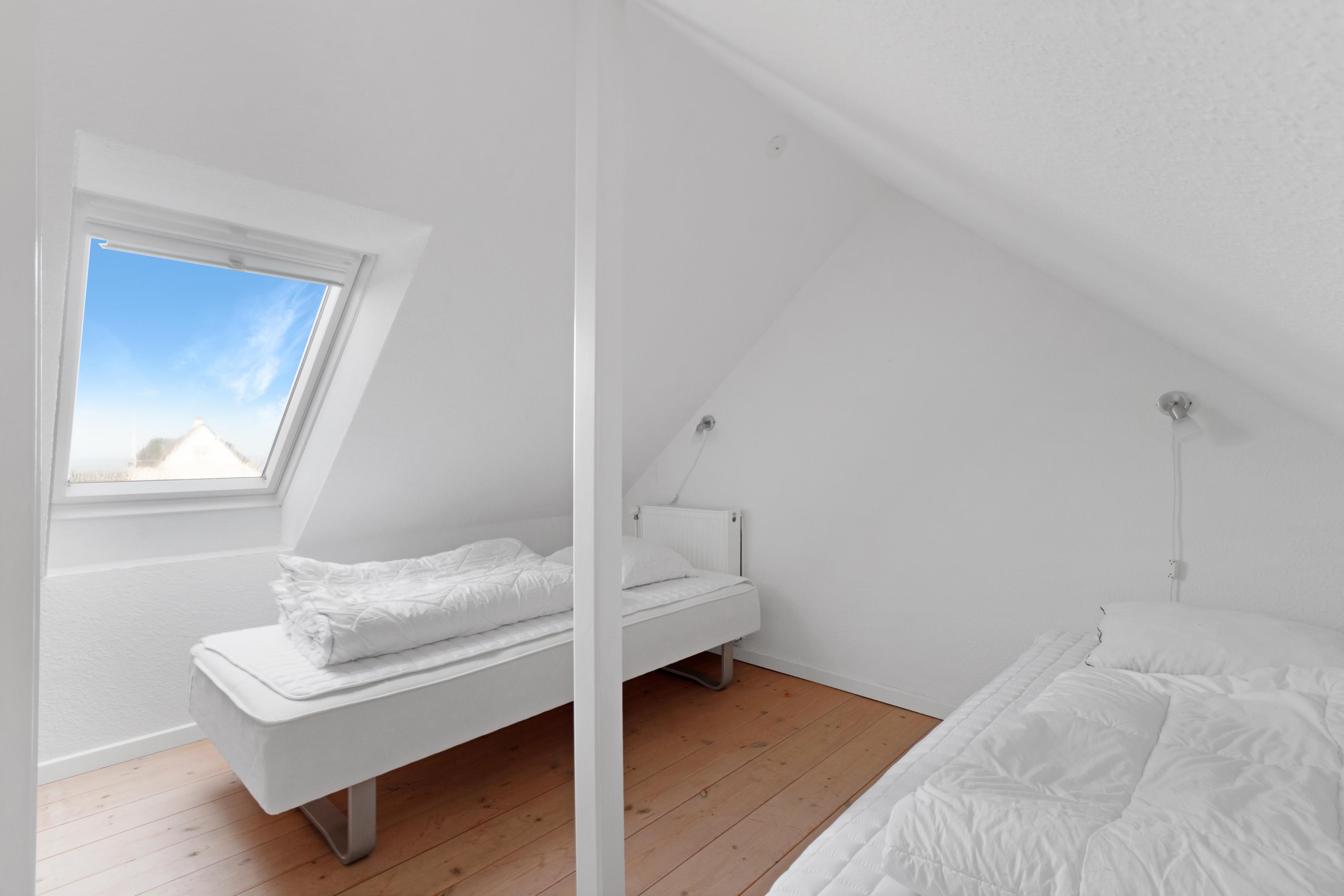 On the 1st floor - which is the bottom floor of the holiday apartment - you will find two lovely bedrooms and a bathroom. This means that you can easily rent the holiday apartment as two families/couples or groups of friends, and still have privacy. On the floor above there are two additional bedrooms and a fantastic bathroom with aqua green mosaic tiles along both the bathroom's spa and shower cubicle. An incredibly cozy bathroom with mosaics you remember. In order to reach the third level, you can’t have difficulties walking, as you have to climb a relatively steep staircase to get to the third and final bedroom. From here, however, the view is also completely unique, with the North West Sea as a backdrop for the sloping skylight.