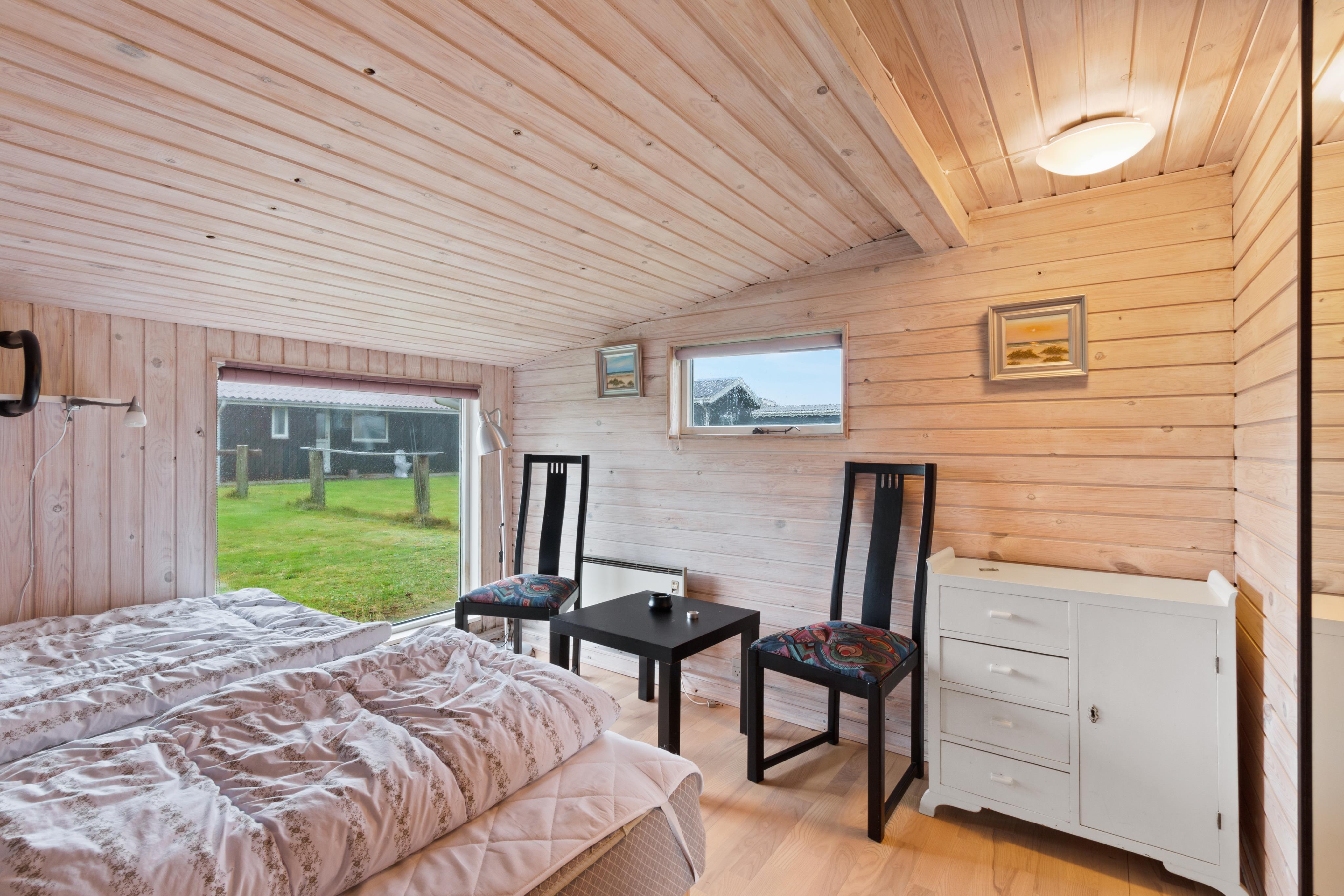 Lovely holiday home with 40 sqm living area with two bedrooms, a toilet, and a kitchen/dining area, plus a 33 sqm garage that contains a bedroom and the house's bathroom. The living room is beautifully bright with a fireplace and access to the conservatory/covered terrace. The kitchen is nice and bright in an open connection with the living room.