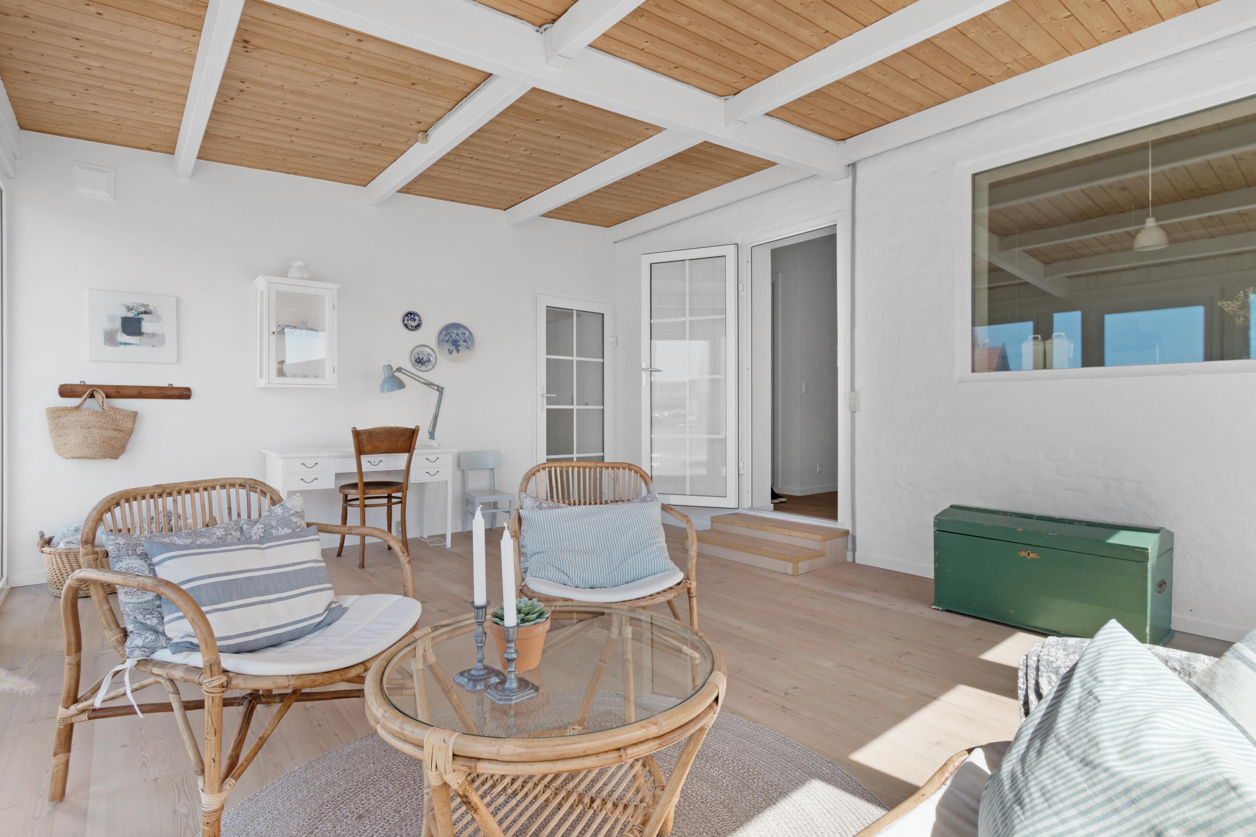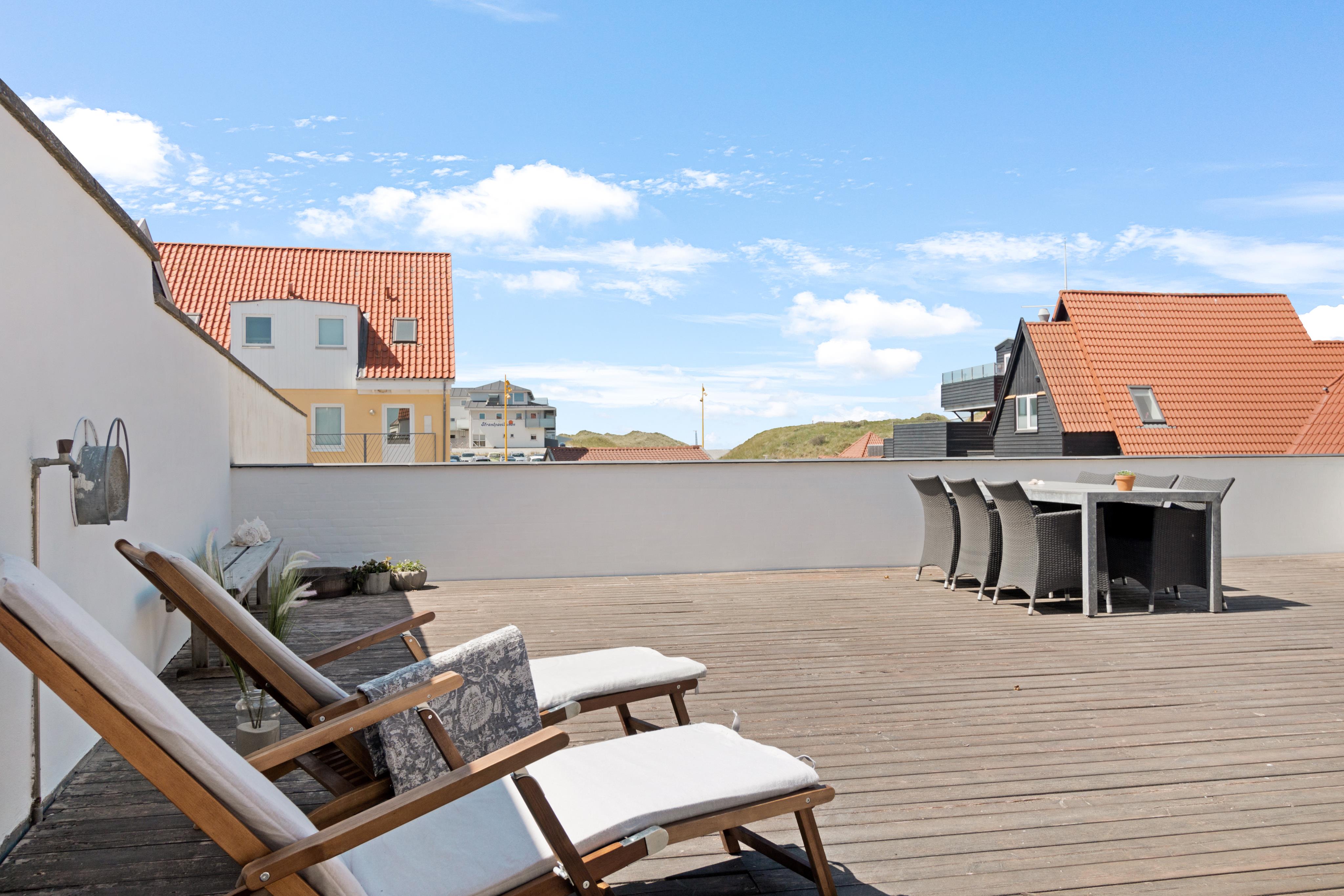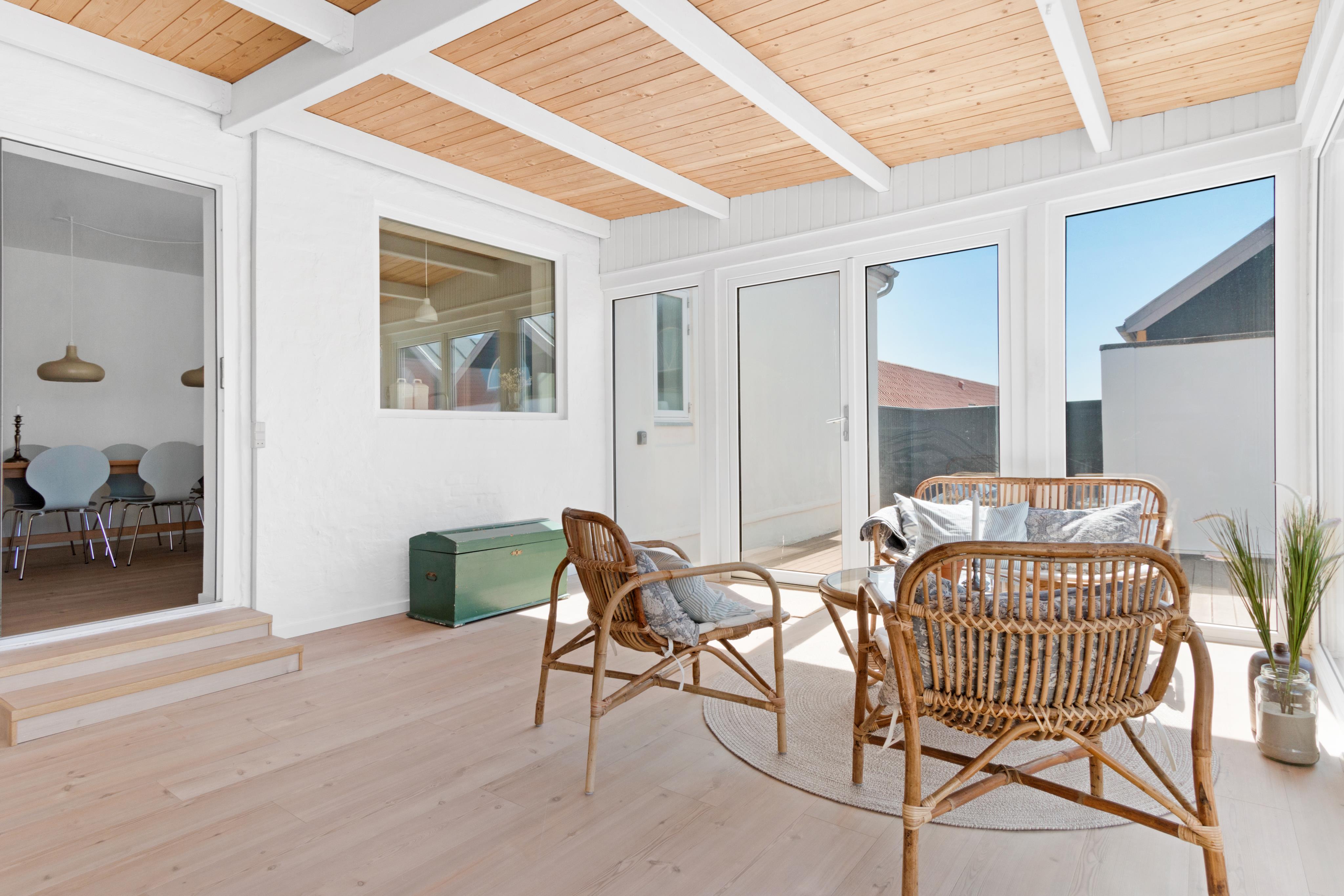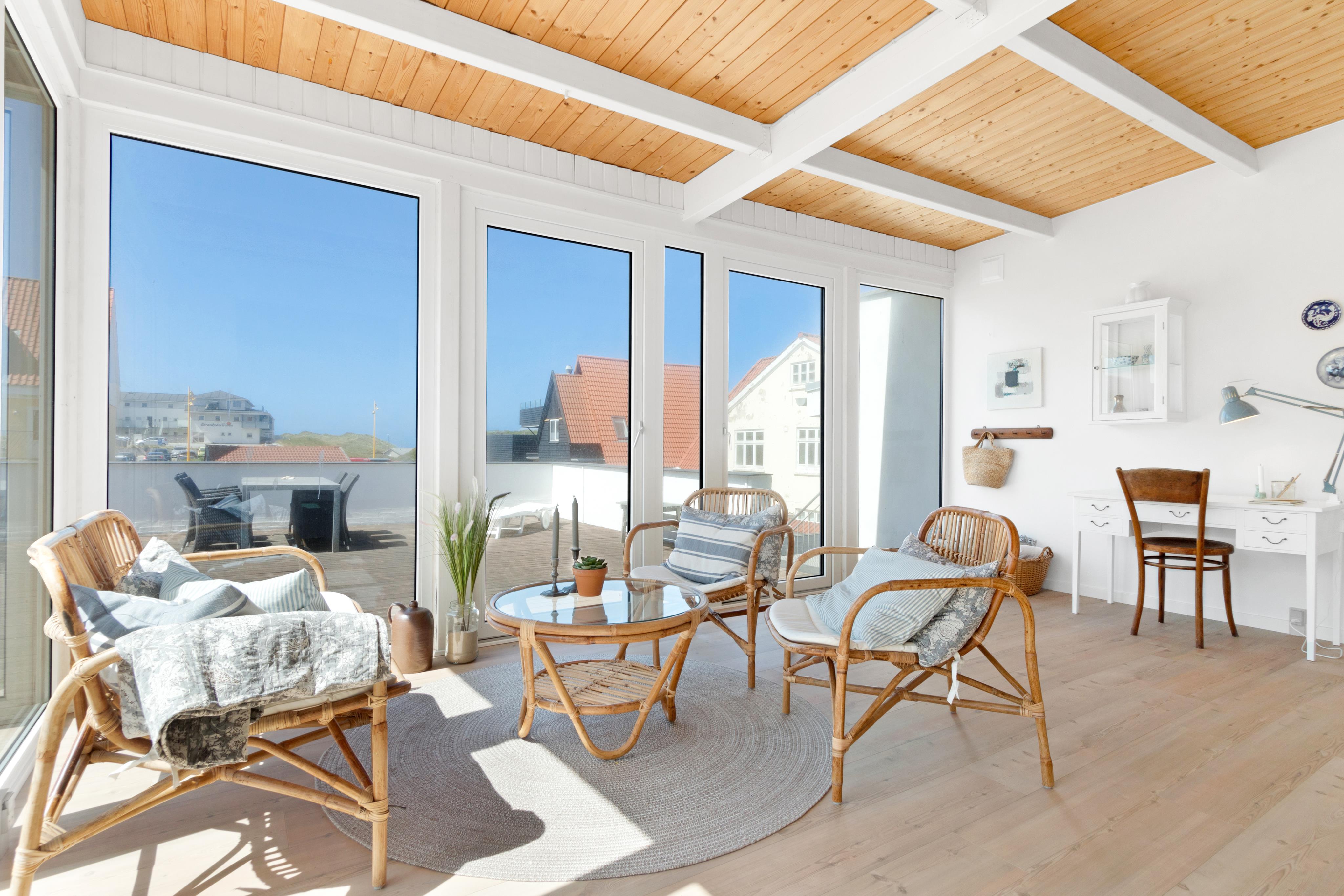 From the apartment's large, bright conservatory, you step out onto the huge terrace, from where you can see the sea and the dunes. Here, the foundation is laid for many hours of holiday relaxation with a backdrop of city life and holiday atmosphere, as well as the roar of the North Sea when the wind is blowing towards the holiday apartment. Two of the conservatory's walls are window sections with no less than three doors out to the terrace. Whether it's blowing wildly or you want to catch the first rays of sunshine of the year, there are plenty of opportunities from the lovely conservatory. Rent this lovely holiday home from By Sommerhuse and get it all.