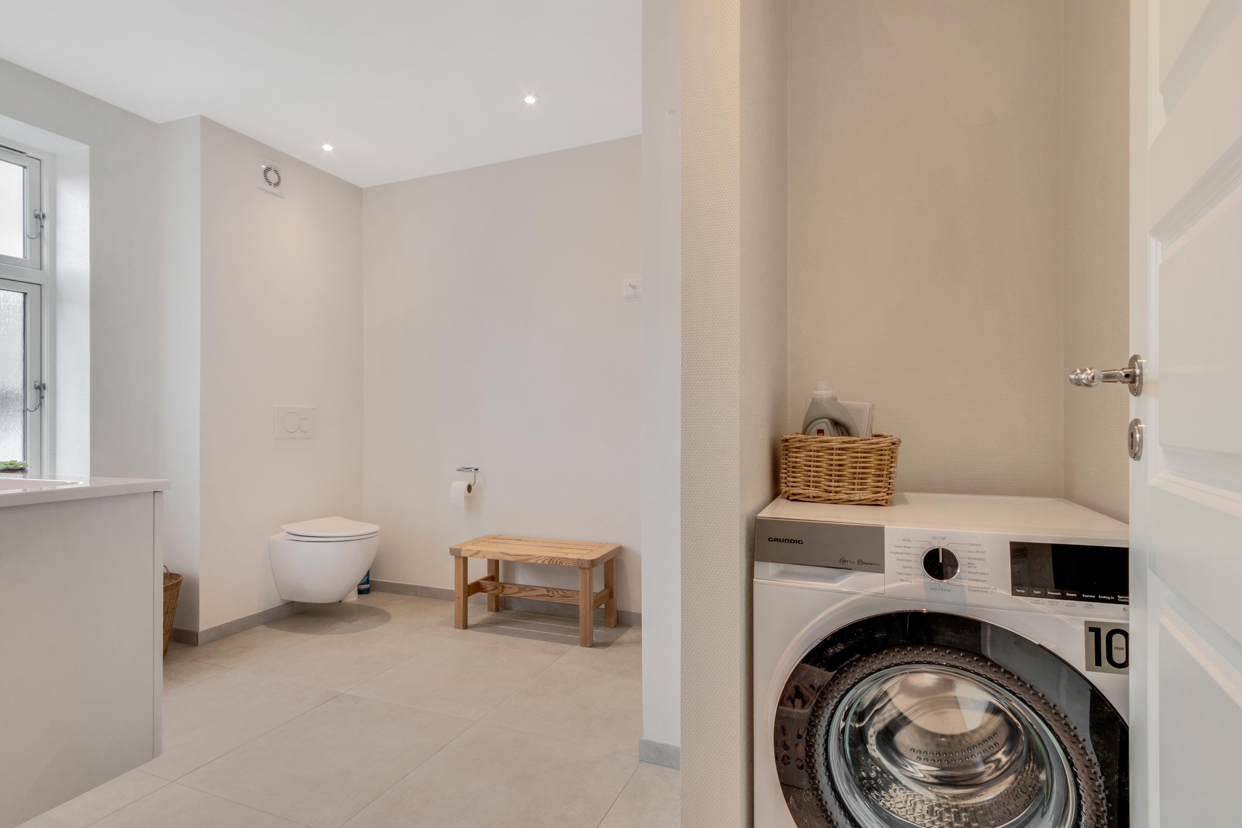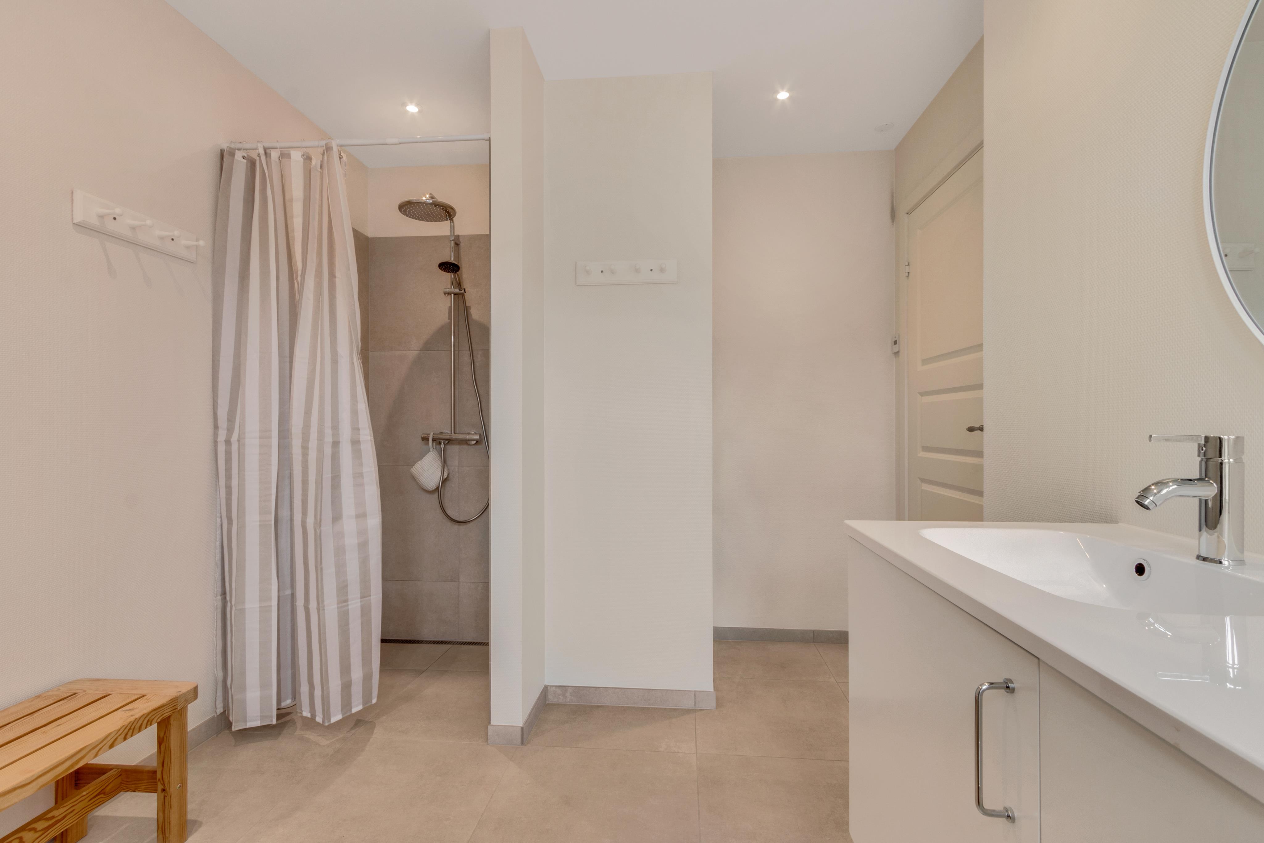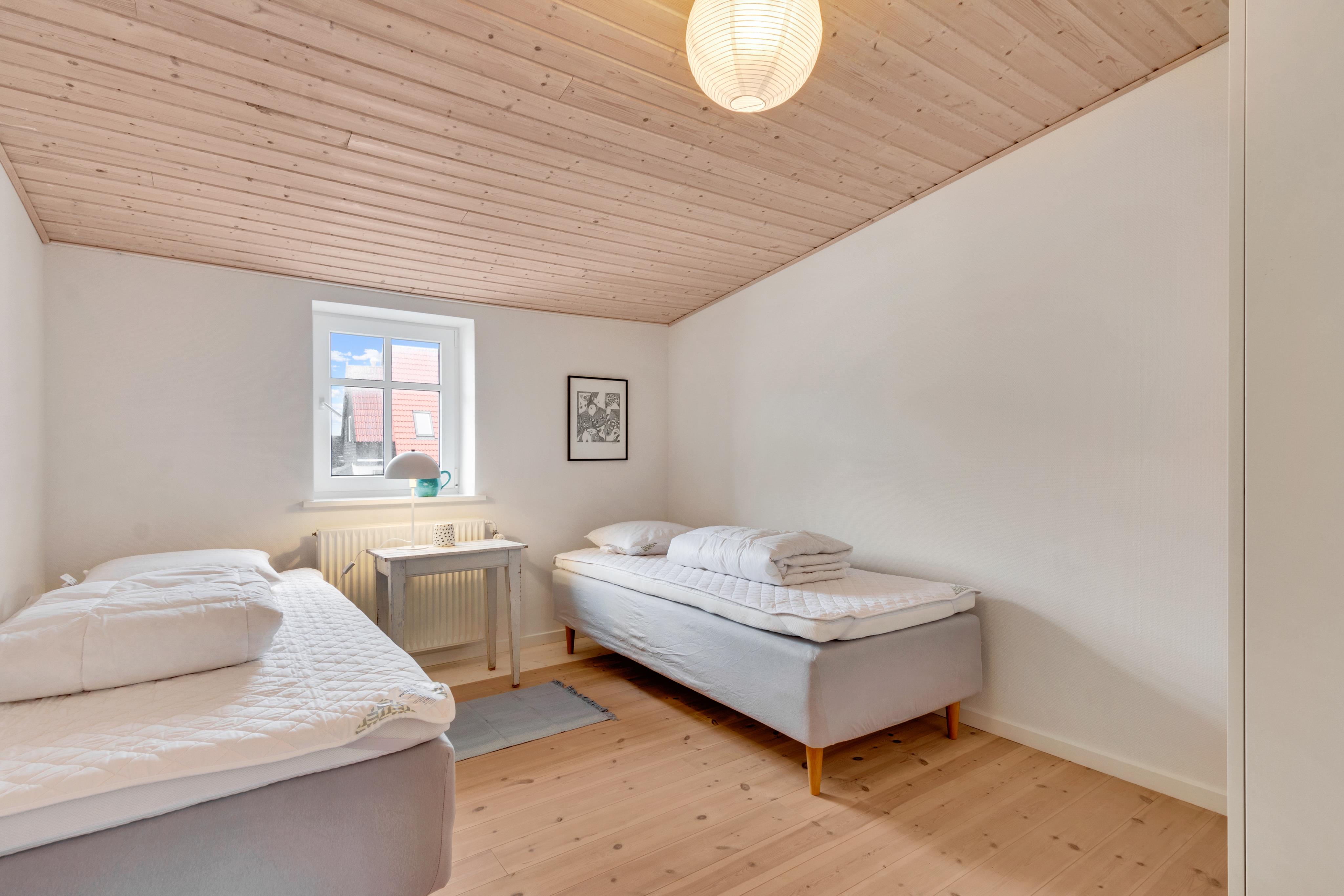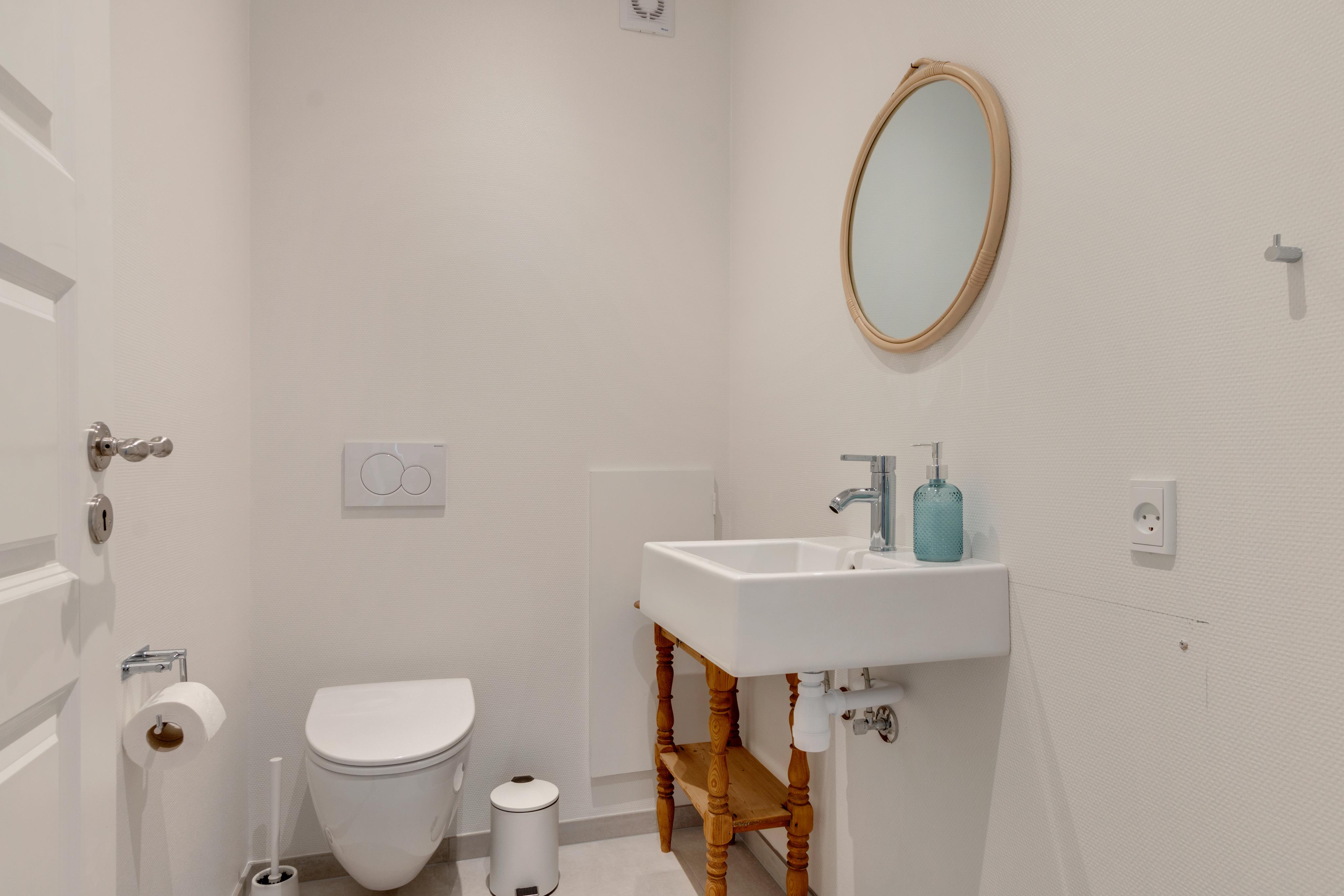 There are four large "common areas": Kitchen and living room en suite, as well as the lovely conservatory and the huge terrace. From there, you can distribute yourselves in one of the holiday apartment's four bedrooms and the passage room - all rooms with two beds each. There is a guest toilet and a bathroom with a toilet. The two bedrooms and the passage room are private from the rest of the apartment if you close the door behind you. There are two steps down, and the offset level gives a nice feeling ofprivacy, even though the conversations continue in the kitchen, living room, conservatory, or on the terrace. The kitchen, toilet, and bathroom are brand new, and so are the floors, while the rest of the house has been completely renovated from A to Z.