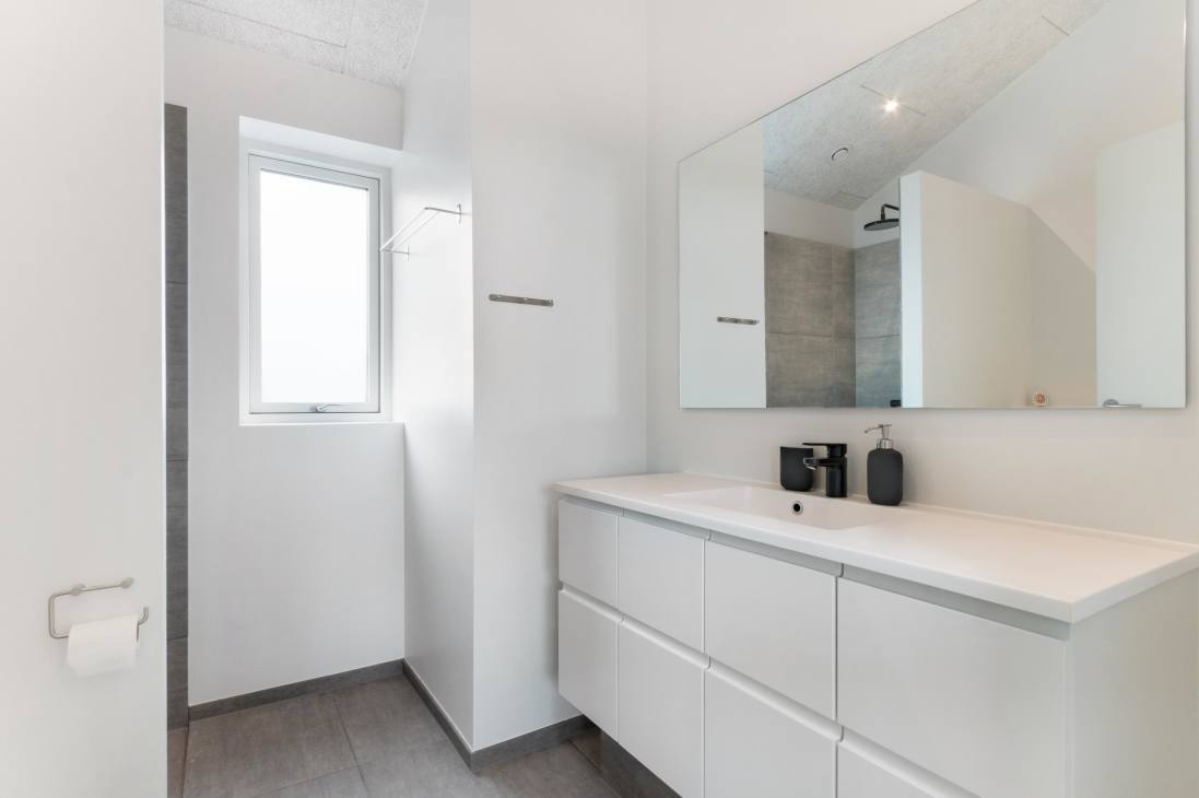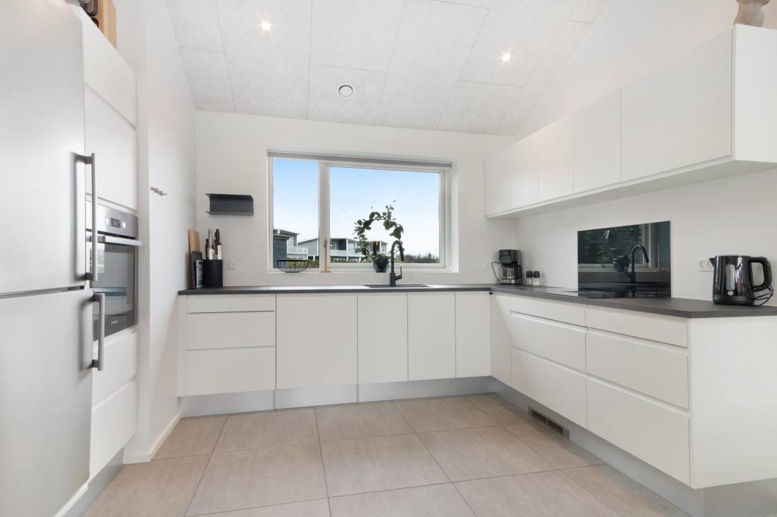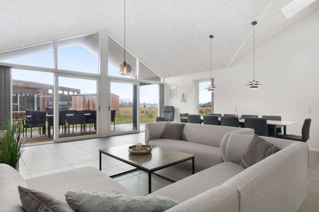 Ulken 6 is bright and spacious - there are high ceilings and an open concept kitchen, family room and living room with direct access to the large terrace of the holiday home. There is plenty of room, and you can lounge around both the large 10-person dining table and the wonderful corner sofa, which invites you to enjoy many hours of coziness. Facing the terrace, the end of the living room consists of a large window section with both view and access to an equally large and spacious outside dining table - also with space for 10 people. It is allowed to bring a small dog.