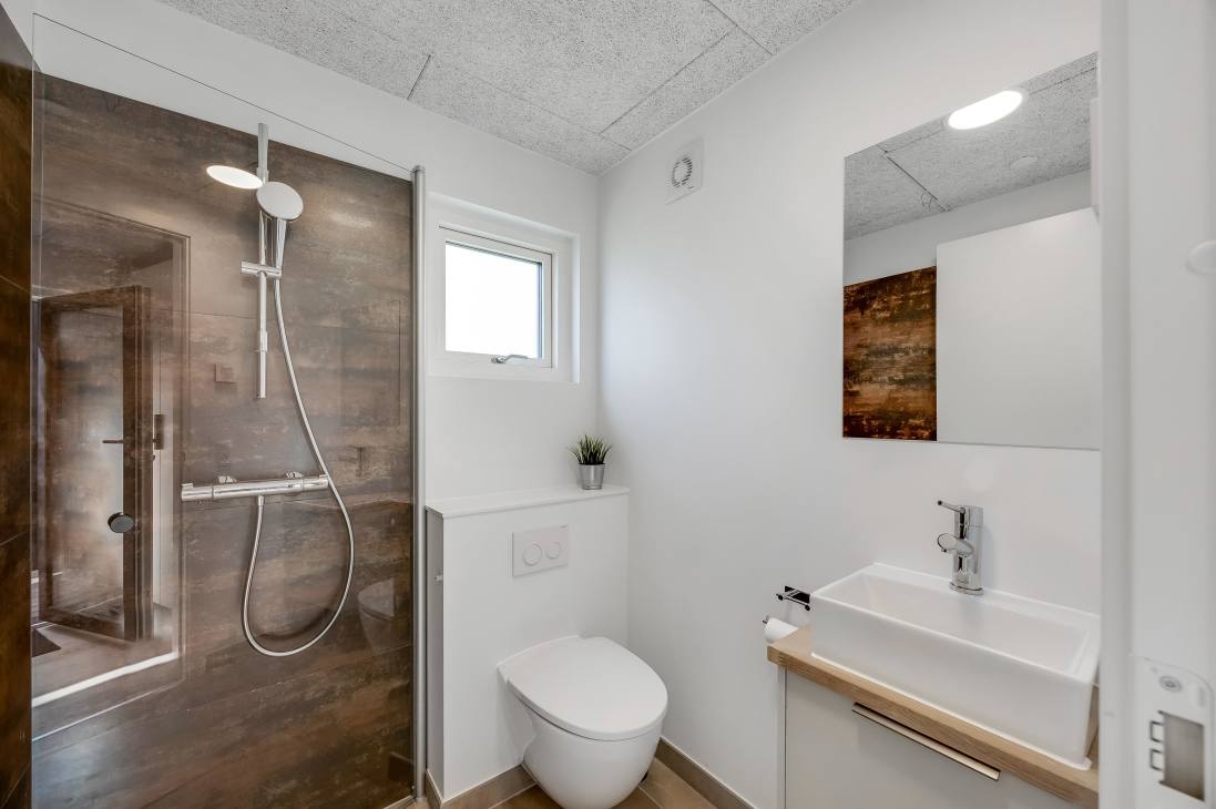 The main house sleeps 6 people, while the cosy annex offers an additional 2 beds and its own bathroom – in total 8 sleeping spaces divided into 3 double beds and 2 single beds. The open-plan kitchen and living area is bright and thoughtfully designed. The bathrooms are spacious and stylish, and a practical utility room is located by the entrance. Although situated in a new development, the house is well positioned with a focus on privacy.
