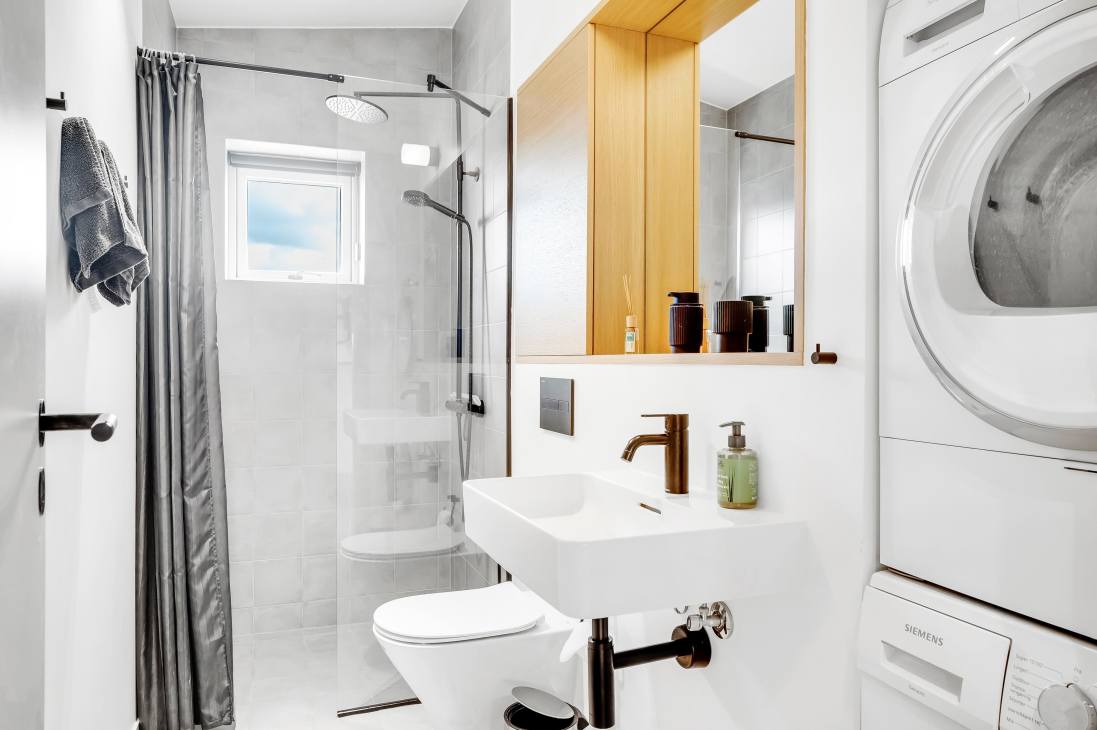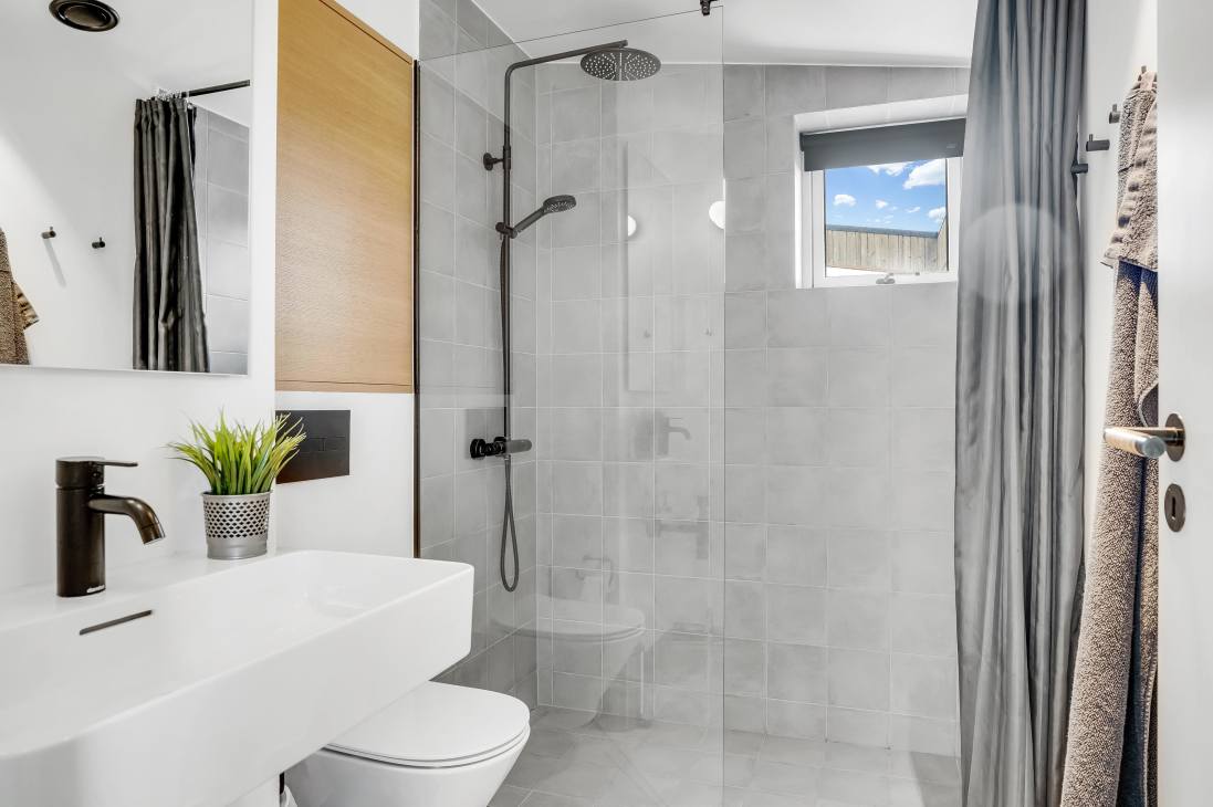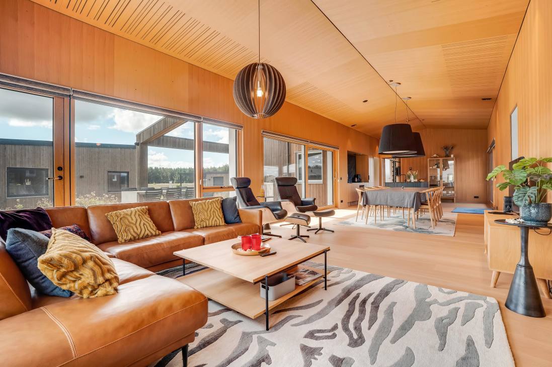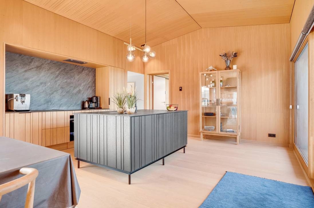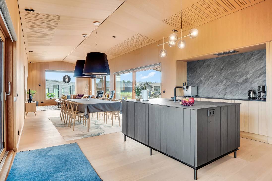 The house accommodates 7 guests across 5 bedrooms with three double beds and two single beds. The heart of the home is the open-plan kitchen and living room, which combines functionality, light, and timeless Danish design. Two elegant bathrooms add extra comfort. The house is part of a newly established neighbourhood with both holiday and permanent homes side by side.