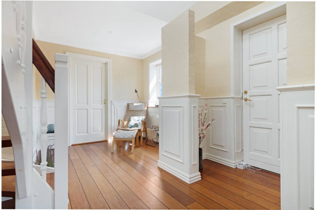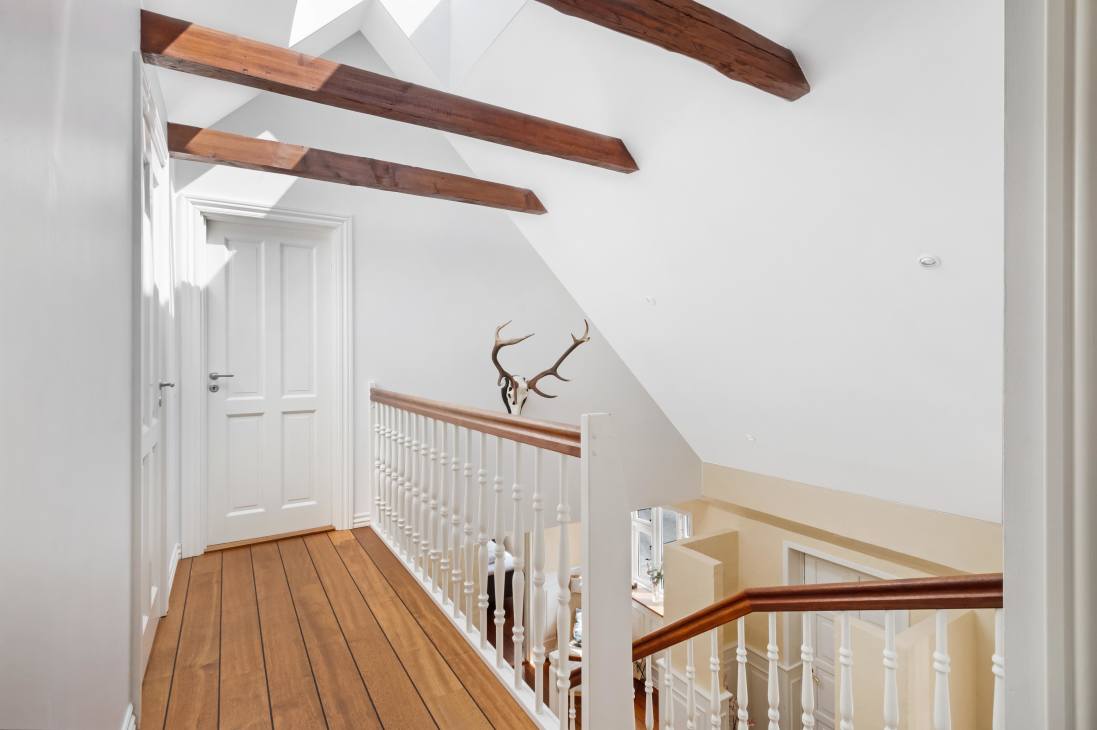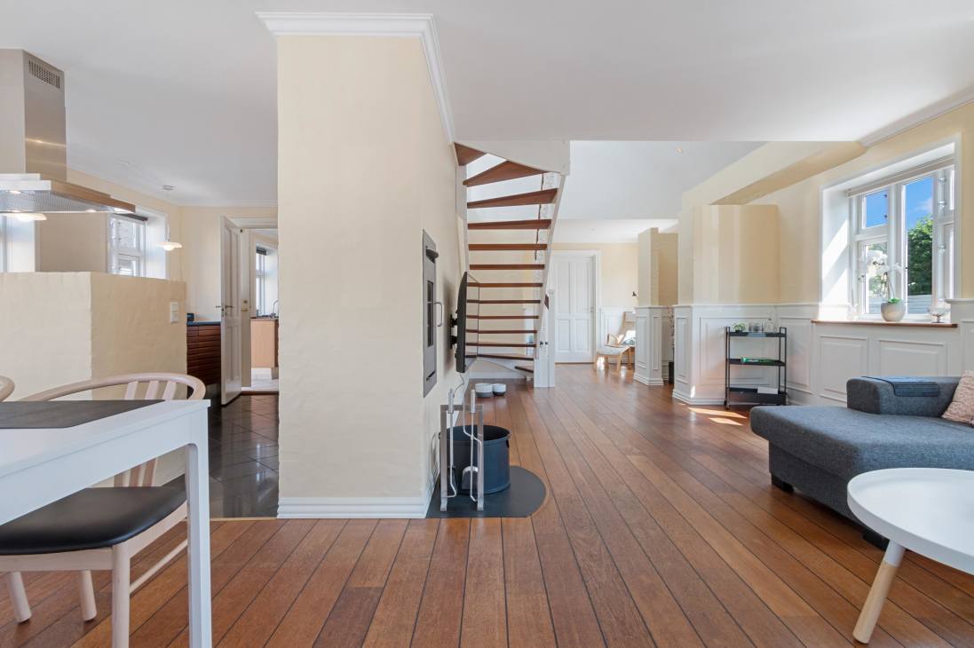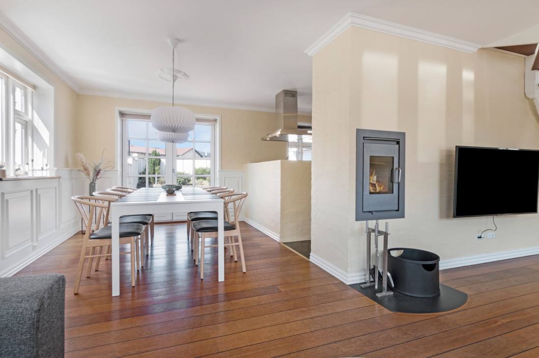 If you are familiar with Løkken, you know that Vendelbogade is centrally located in the middle of town, right next to the pedestrian street and the town square, where there is a wonderful holiday atmosphere and plenty of opportunities for experiences with the whole family or friends, almost all year round! If you cross the pedestrian street, you will quickly find yourself in a more sandy environment as the beach and the beautiful North Sea is located approximately 350 meters from the property. Here, you will find this bright and lovely vacation home for rent with spacious and bright rooms, a great layout, charming paneling, and a beautiful open staircase leading to the first floor.