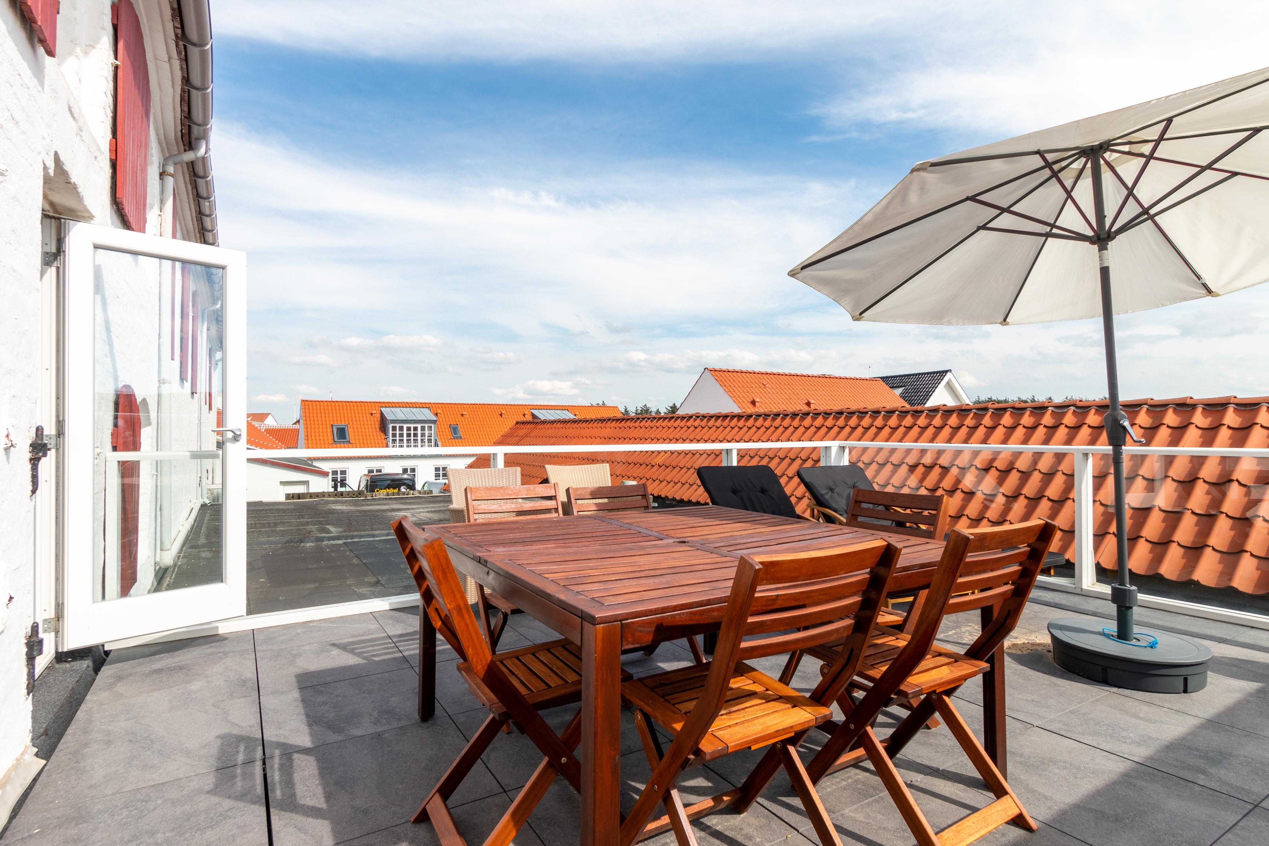 As mentioned, the place is legendary and so will the holiday apartments become! Lovely, bright rooms that are practically decorated with exposed beams in Norwegian carved wood. This apartment is the largest, and it even has a beautiful, large terrace in nice shelter and sun, which shines with the apartment. The holiday apartment has a view of Løkken town and you can spot the North Sea.