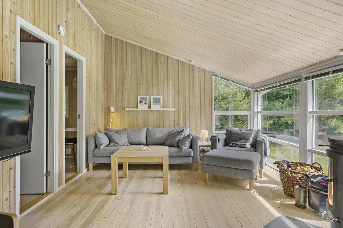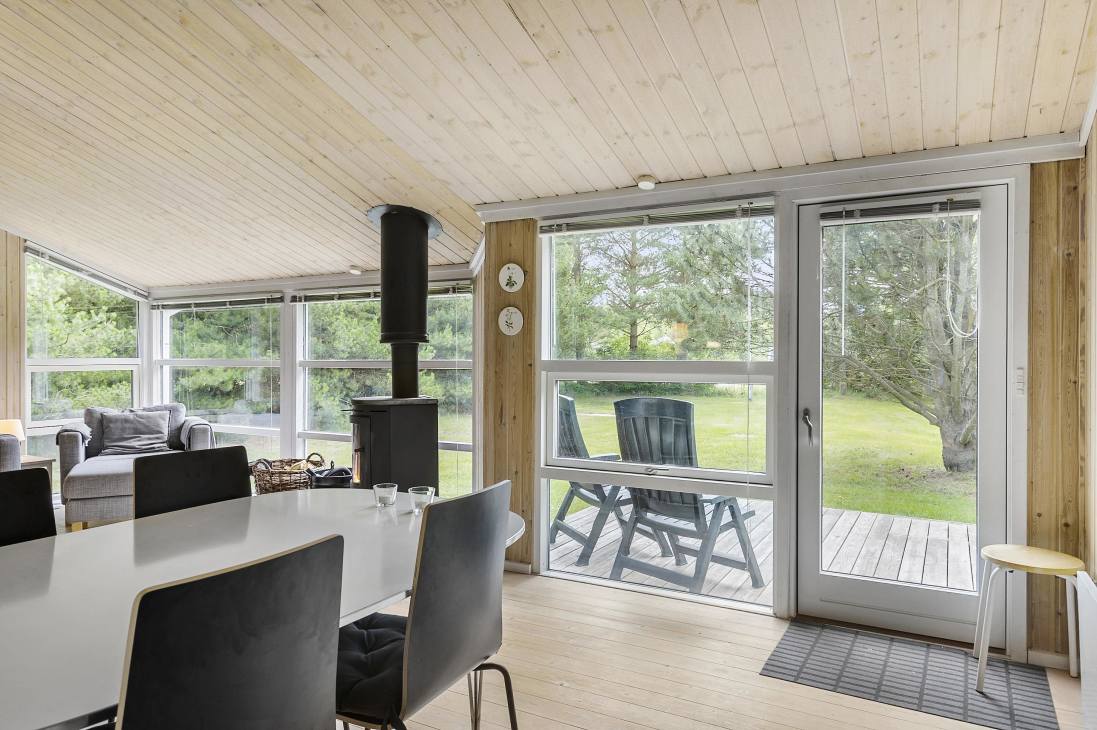 This holiday home is a classic Danish summerhouse with a delightful kitchen/dining area and an open-plan living room. You can lounge in front of the wood-burning stove or play cards at the dining table while the food simmers in the kitchen. From the cozy kitchen/dining area, there's access to the holiday home's lovely terrace and large garden, surrounded by beautiful nature on all sides. The house has a total of three bedrooms and a large bathroom with a sauna. In one bedroom, there are three beds, including a bunk bed and a loft - a room that truly invites summerhouse coziness. The other two bedrooms have double beds, accommodating a total of 6 people.