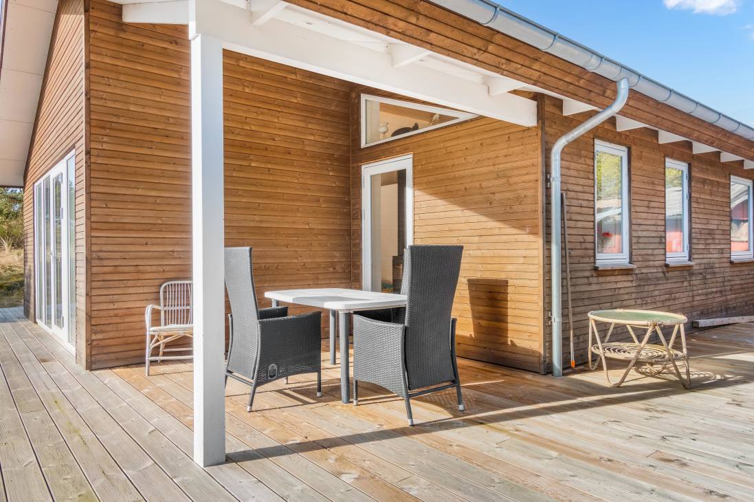 When you want to enjoy the sun or the holiday home on Raabukvej, you have plenty of opportunity to avoid any curious glances from passers-by or neighbors. The house is nicely shielded from the road and the large terrace faces a secluded and also hilly backyard. The garden is almost divided into two, and in the back part there is an area where it is obvious to enjoy badminton or playing games. Or you can set up a tent and let yourself or others enjoy the authentic nature in peace and quiet.